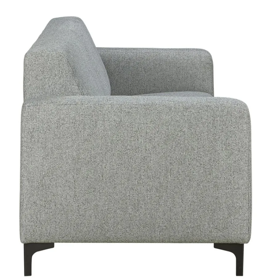 De 2,5-zitsbank Ameland is bekleed met stof Fermo. Deze geweven structuurstof is gemaakt van 100% polyester. De zachte stof in kleur Sky is een gemêleerde grijstint.
