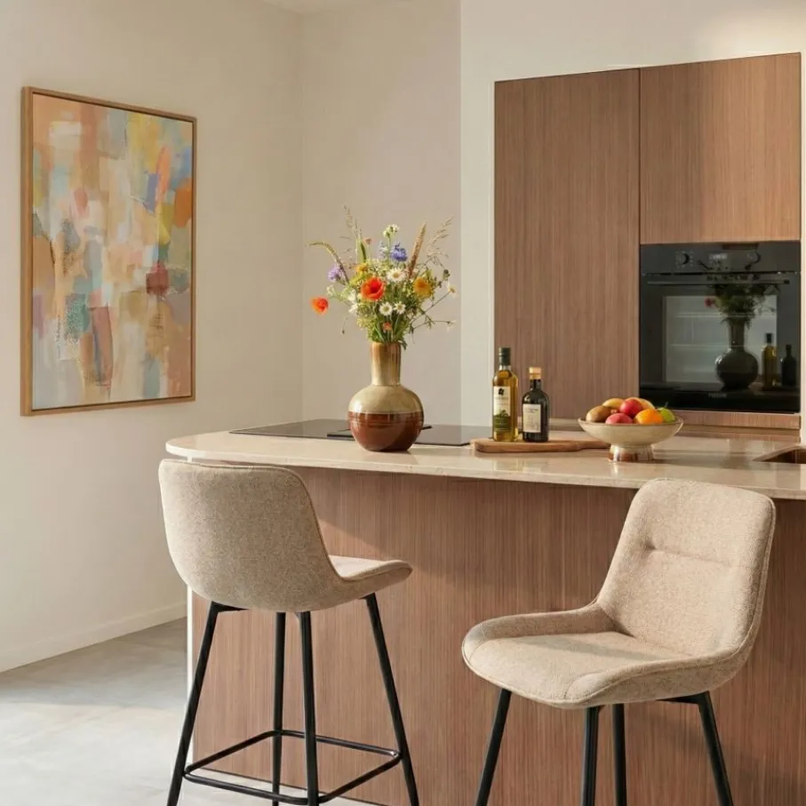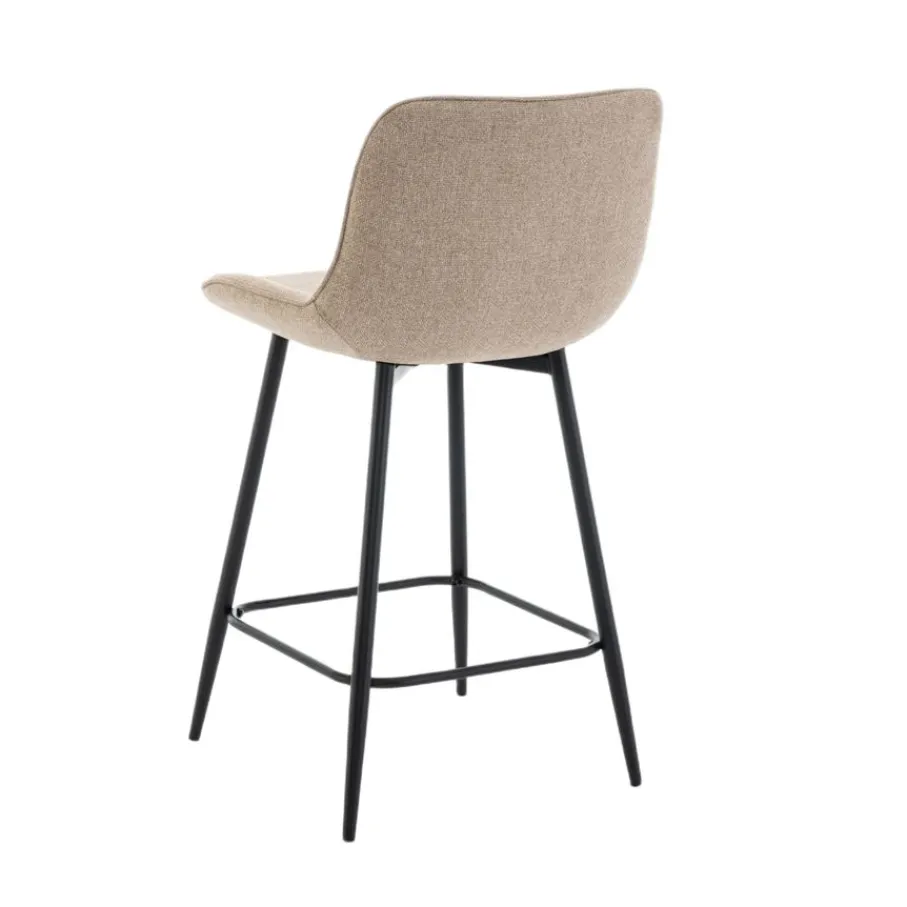 Barkruk Fay is bekleed met een prachtige beige textielstof die makkelijk te combineren is met verschillende interieurstijlen. De zachte, neutrale kleur zorgt voor een warme en uitnodigende uitstraling, terwijl het materiaal zowel duurzaam als prettig aanvoelt. Een slimme keuze die jarenlang meegaat en je interieur compleet maakt.