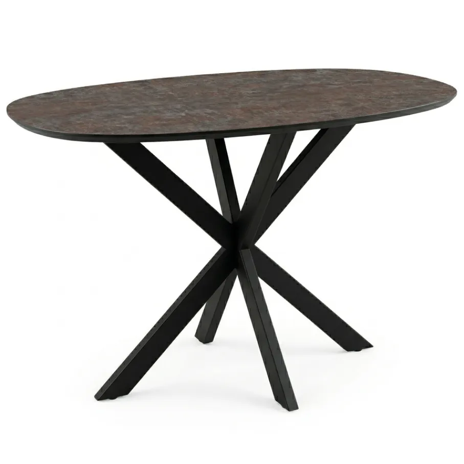 Wat een eyecatcher is deze bartafel Aarhus! Het Deens ovale blad met een schitterend Cortenstaal decor in een grijs/bruine tint zorgt voor sfeer in je interieur. Het blad heeft een MDF basis met een HPL finish. Deze High Pressure Laminate afwerking maakt Aarhus sterk en goed bestand tegen slijtage. De stevige zwart metalen poten maken de stoere look helemaal af. Voeg bartafel Aarhus toe aan je keukeneiland of bartafel en geniet van een moderne en uitnodigende setting.