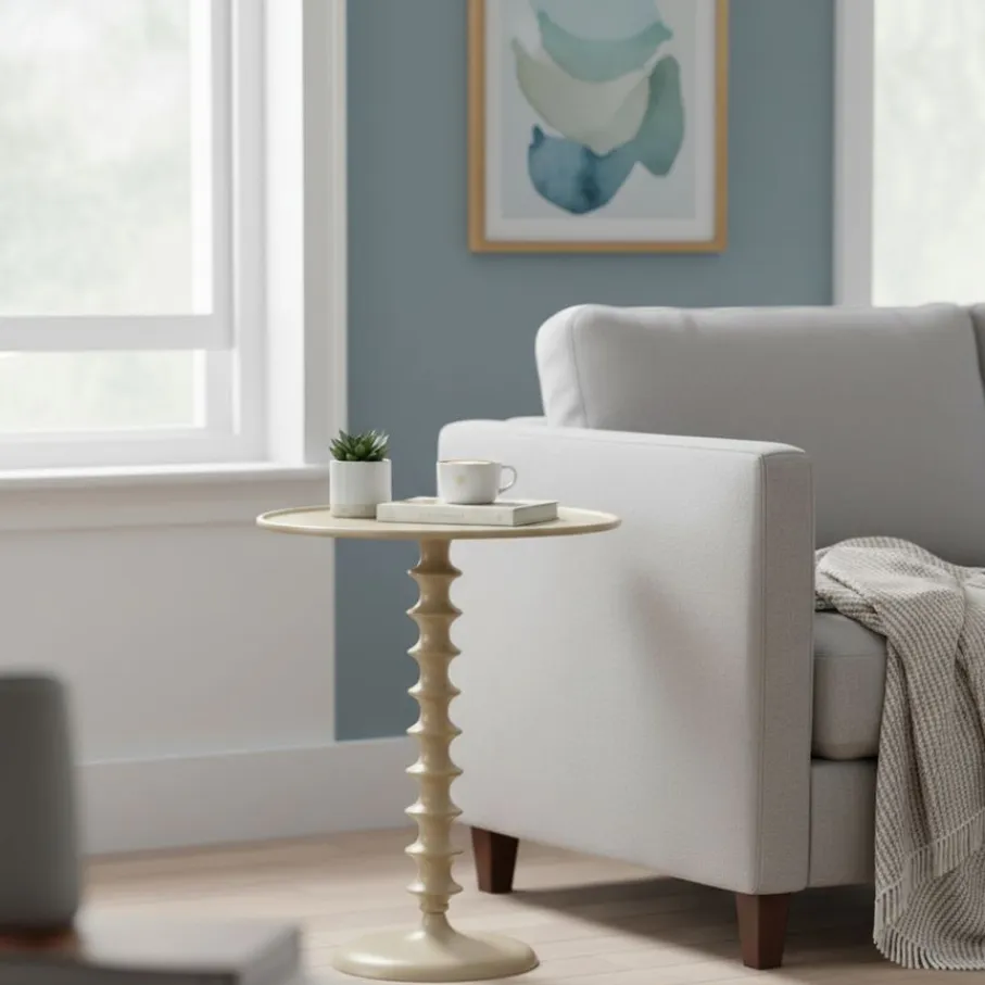- Een speelse twist in je interieur: Met zijn unieke gedraaide poot en ronde blad is bijzettafel Marty een moderne blikvanger die direct karakter toevoegt aan jouw woonruimte.