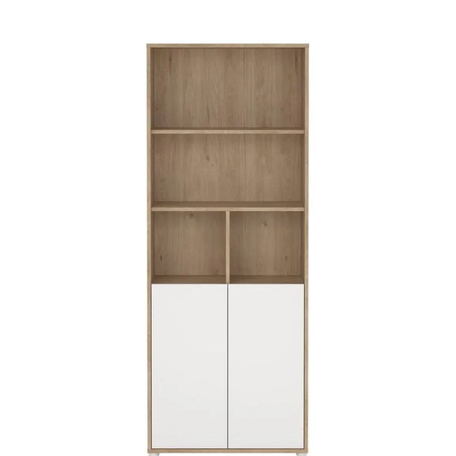 Boekenkast Bram heeft bovenin vier open vakken, ideaal voor boeken die je graag in het zicht hebt of decoratieve objecten. Daaronder zorgen de twee deurtjes voor een opgeruimde uitstraling, ideaal om spullen uit het zicht te bewaren. De deuren zijn greeploos, wat een minimalistische look geeft.