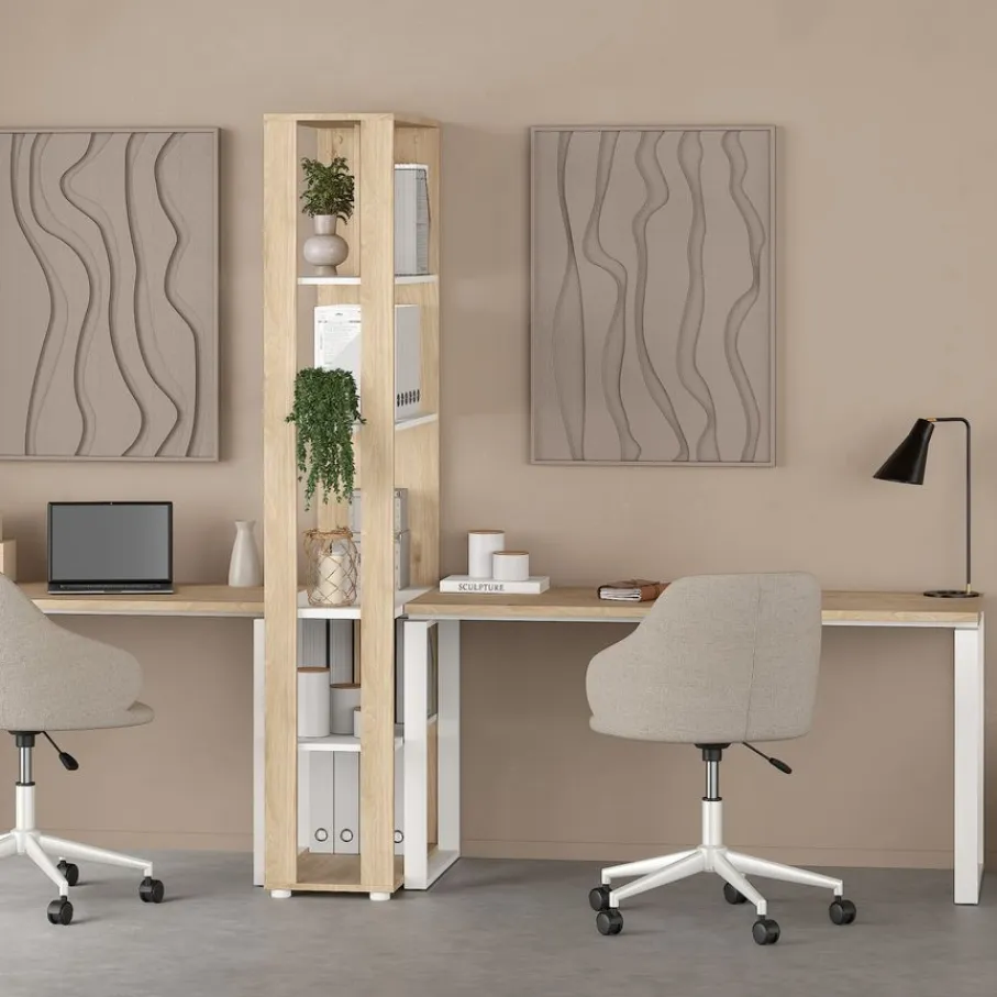 - Eiken houtlook met strak wit metalen onderstel