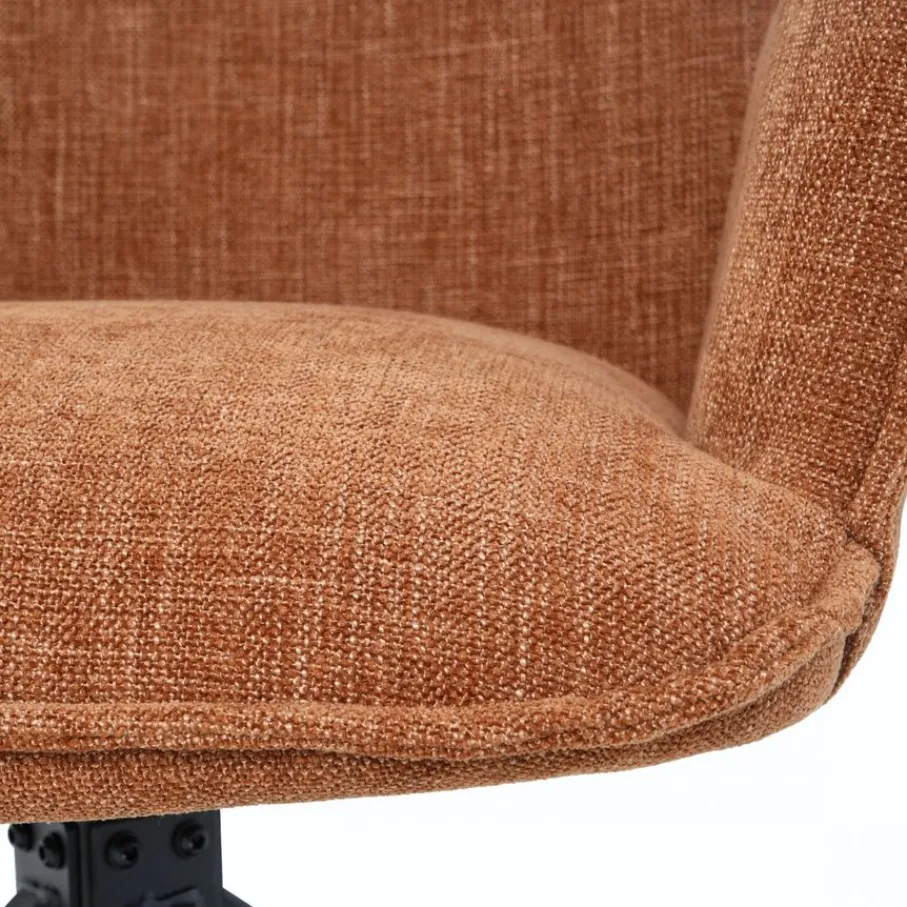 De bekleding is een geweven stof van 20% linnen en 80% polyester in gemêleerde roestbruine kleur. Deze stof met een fijne structuur zorgt voor een sfeervolle en uitnodigende uitstraling.