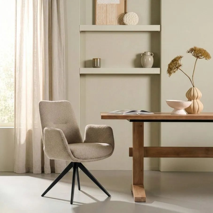 - Warmte en stijl in één: De zachte bouclé bekleding geeft je eetkamer direct een moderne en uitnodigende sfeer. Jouw huis wordt er écht gezelliger van!