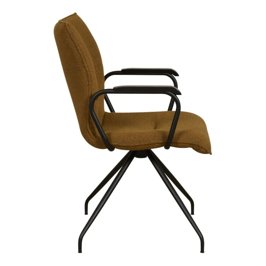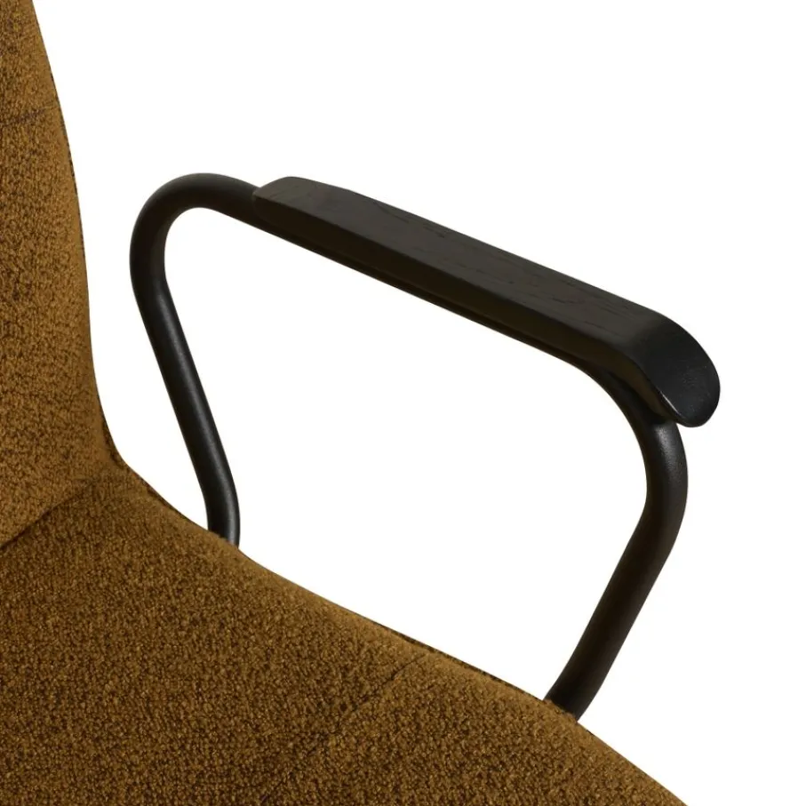 - Luxueuze bouclé bekleding: De cognac kleurige stof voegt warmte en textuur toe.