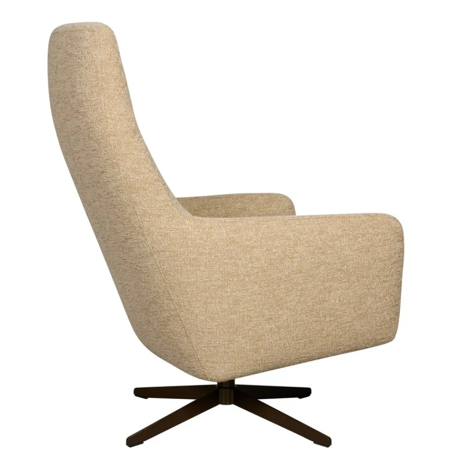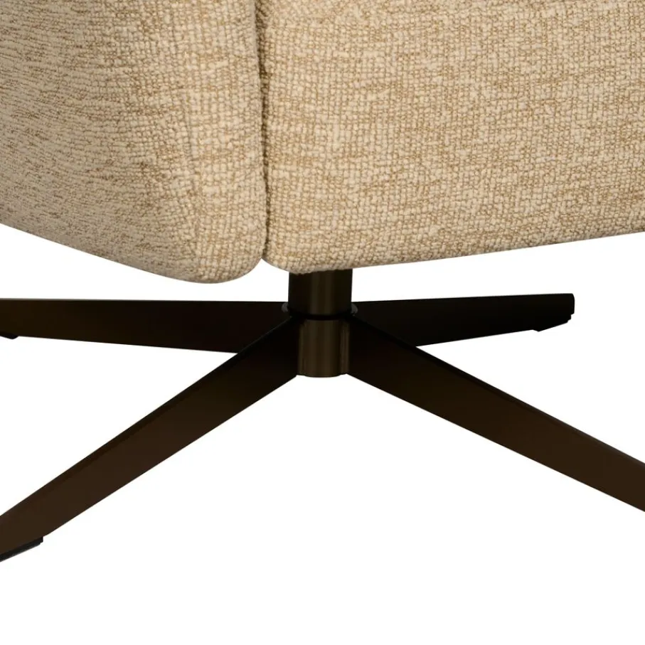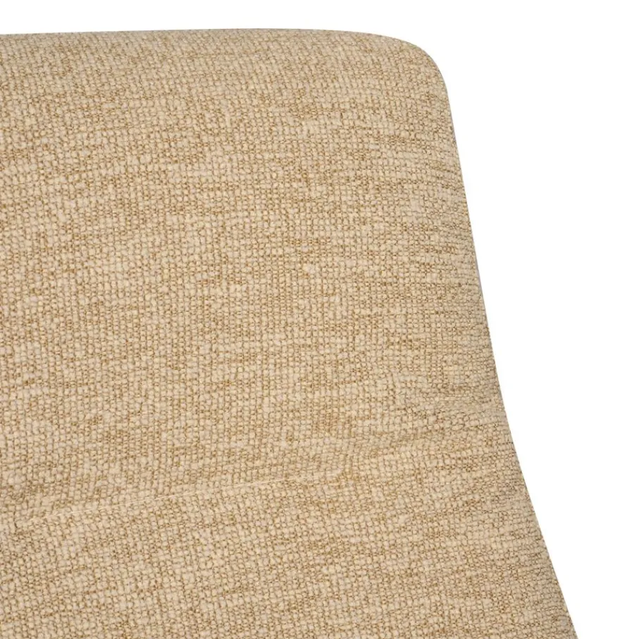 De fauteuil is bekleed met stof Lodge van 100% polyester in kleur Sand. Deze bouclé stof heeft een gemêleerde zandkleur. Deze neutrale en warme tint is makkelijk te combineren.