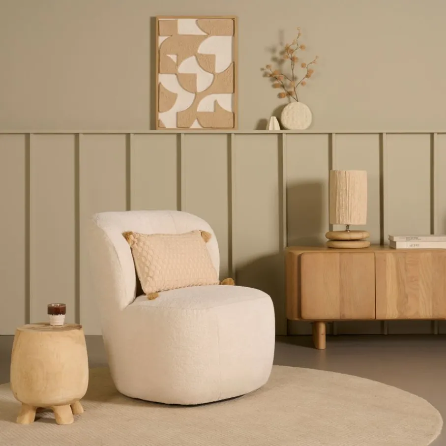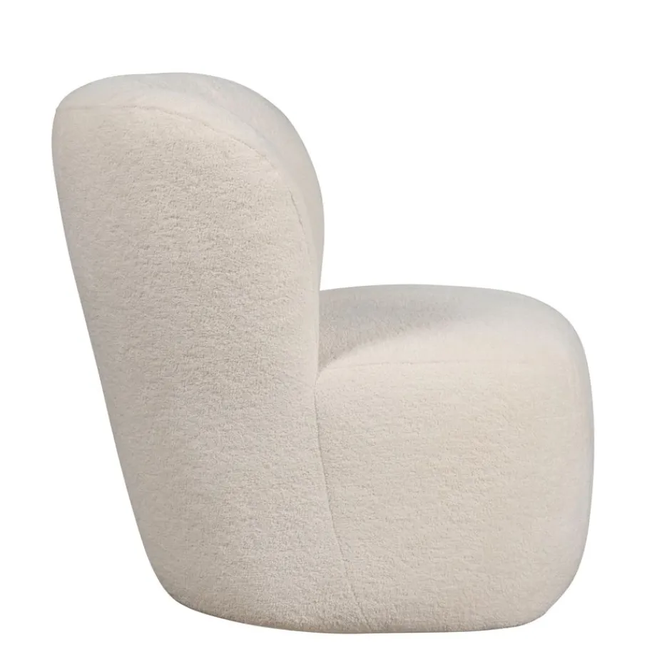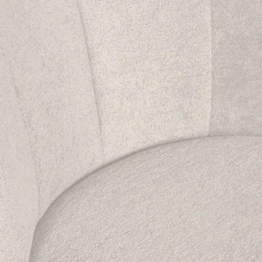 De draaifauteuil heeft een bouclé bekleding met een rijke structuur. De stof is aangenaam zacht en hierdoor uitnodigend. De crème kleur is een romige wittint, een kleur die makkelijk te combineren is.
