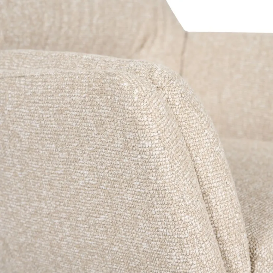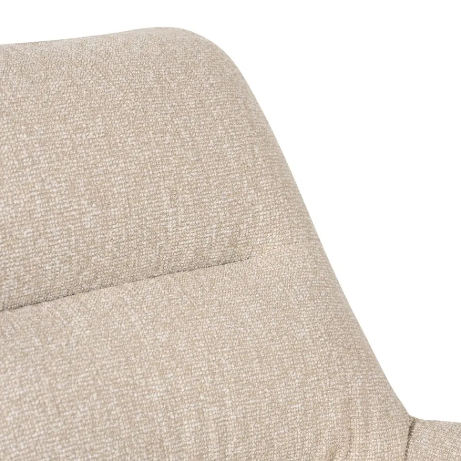 Deze fauteuil is bekleed met stof Lodge, een materiaal van 100% polyester met een robuuste structuur. Het heeft een Martindale van 100.000, wat het geschikt maakt voor intensief woongebruik. Het is sterk en kleur- en slijtvast, en dus duurzaam in gebruik. Deze bouclé stof heeft een beige kleur met subtiele kleurnuances. Dit brengt een vleugje elegantie in elke ruimte, waardoor je huis met draaifauteuil Swift nét dat beetje extra sfeer krijgt.
