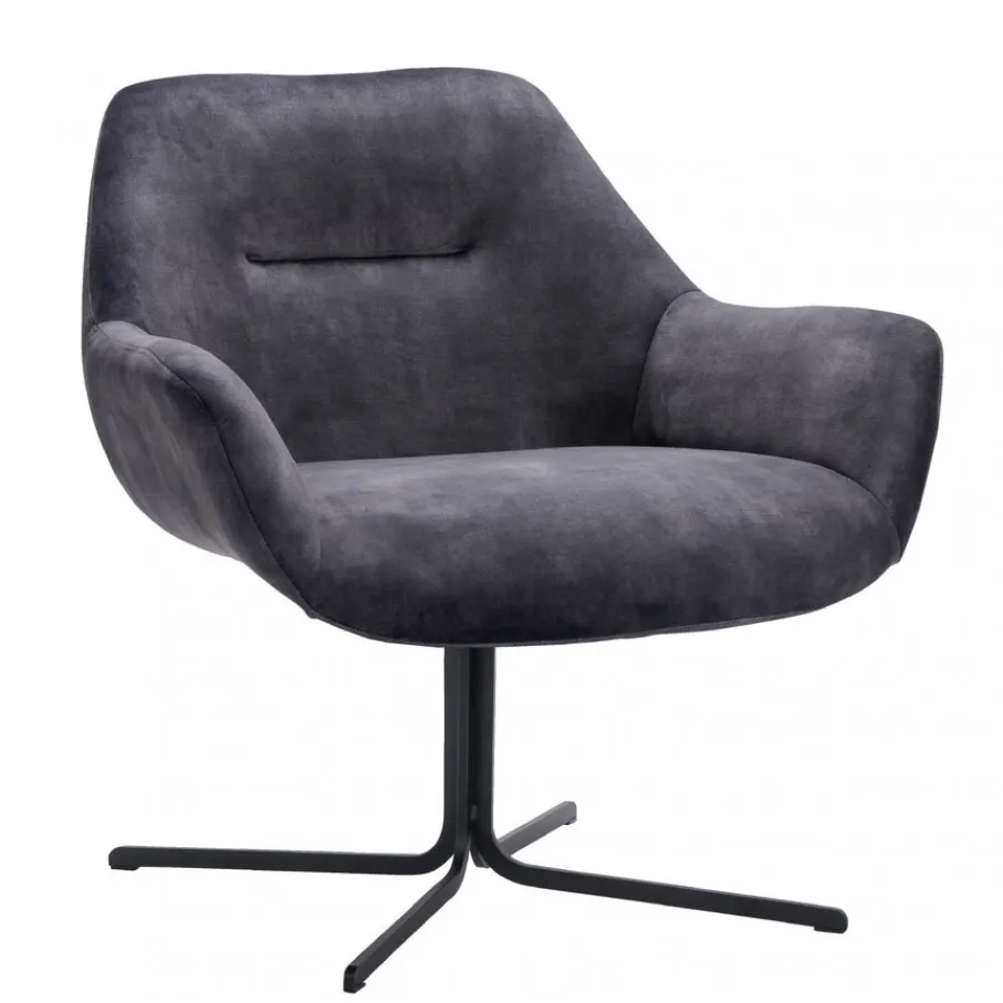 De fauteuil is bekleed met een fluwelen stof van 100% polyester, een stof die niet snel verkleurt of verslijt. Deze stof heeft door de mooie vleug een wat wolkerige en luxe uitstraling. De kleur is antraciet, een stijlvolle donkergrijze kleur.