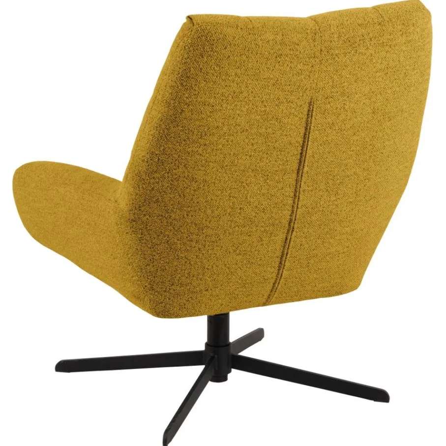 Draaifauteuil Vrijhoeve is een bouclé fauteuil met een trendy hedendaags design. De okergele stoel heeft een luchtig voorkomen doordat er geen massieve armleuningen aanzitten. En toch is de stoel uitnodigend door de comfortabele zitting. De zitting heeft een vol uiterlijk en is fraai afgewerkt met een carréstiksel (vakverdeling). De stoel staat fantastisch in veel diverse interieurstijlen, van minimalistisch modern tot warm landelijk.