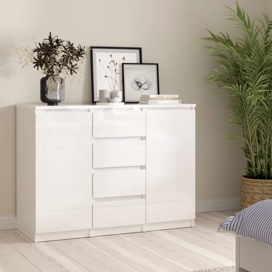 - Laat jouw favoriete decoratie stralen op het ruime en spiegelgladde bovenblad van dit stijlvolle dressoir.