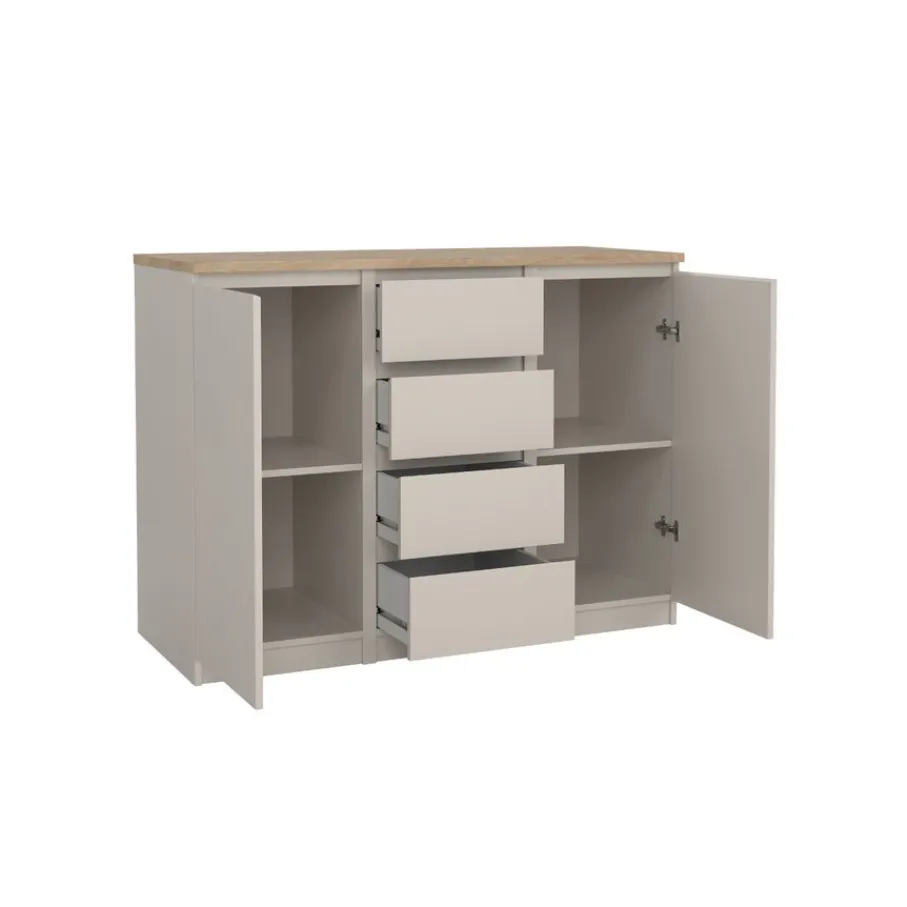 Het Luna dressoir heeft twee ruime vakken met binnenin ieder vak een verstelbare legplank. Hierdoor zijn de ruime opbergmogelijkheden flexibel in te delen. In het midden zitten vier ruime lades op soepele geleiders, waardoor Luna lekker veel opberg mogelijkheid biedt.