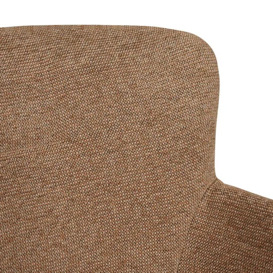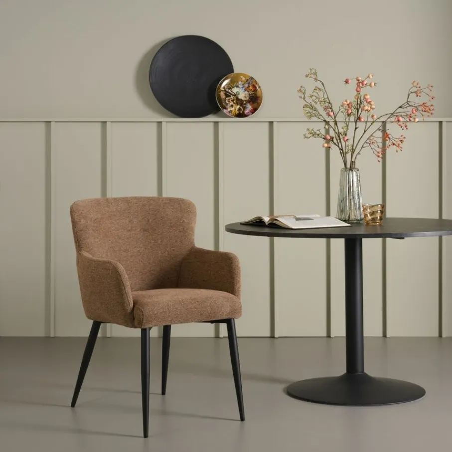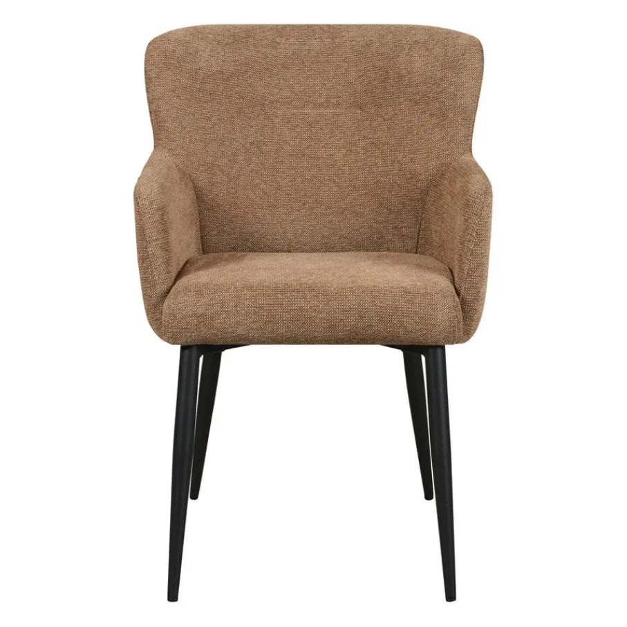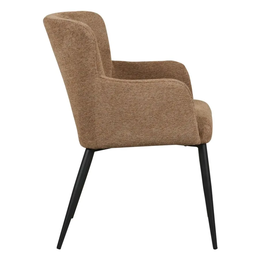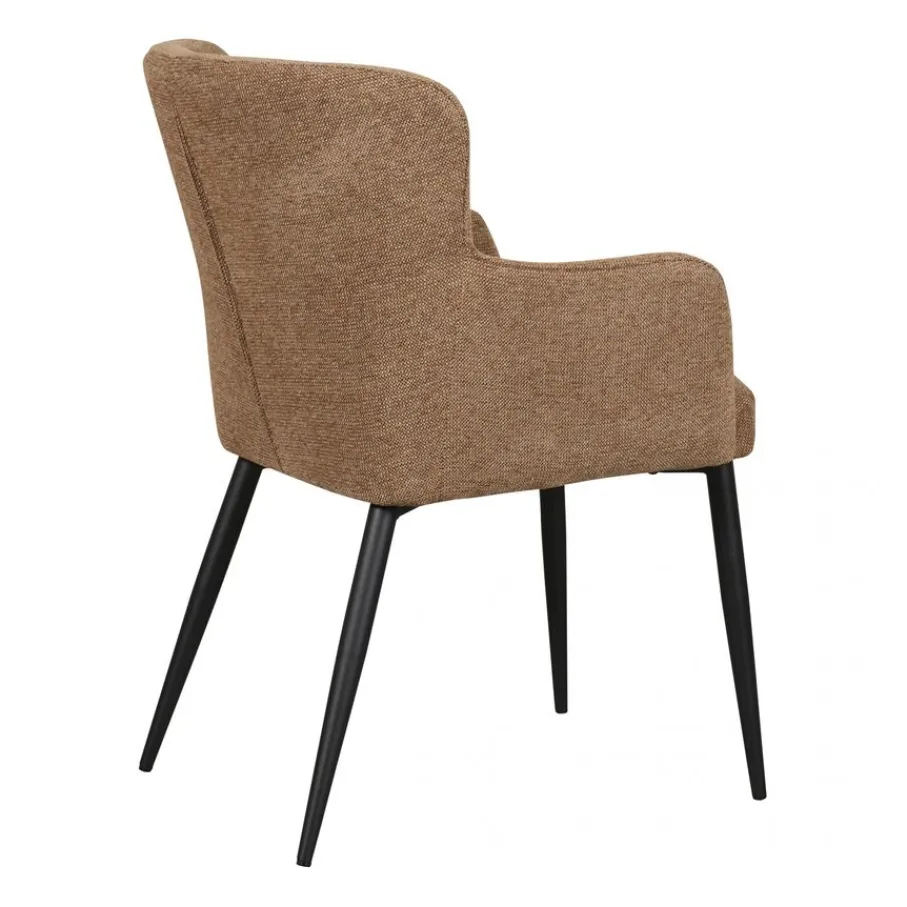 De eetkamerstoel heeft een zachte en neutrale bekleding. De stof is gemaakt van 100% polyester en is sterk en goed kleurvast. Het heeft een mooie structuur en de kleur is een gemêleerde hazelnoot bruin tint. In combinatie met de slanke poten van zwart metaal heeft eetkamerstoel Alba een look die makkelijk combineert.