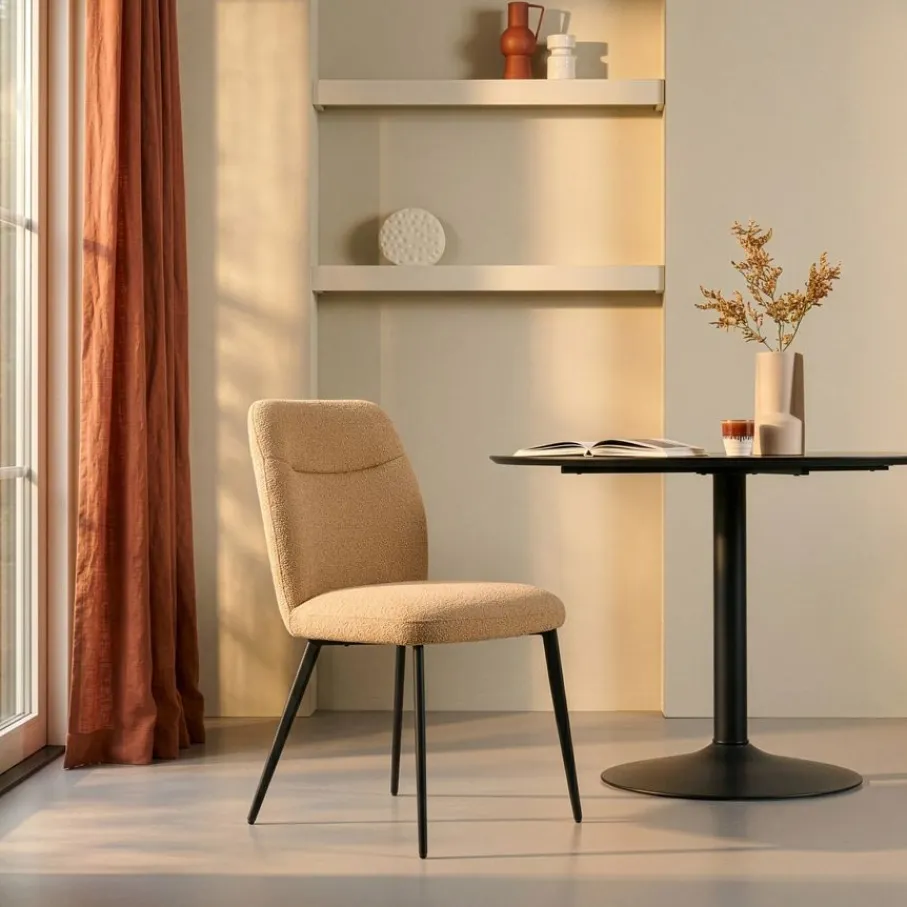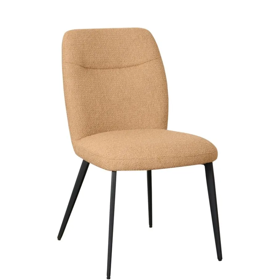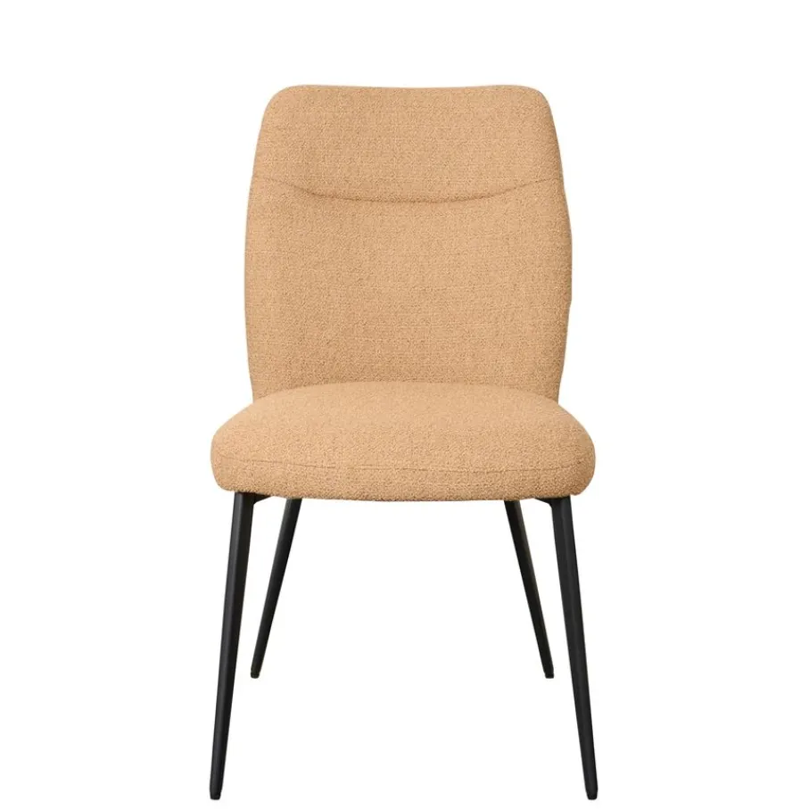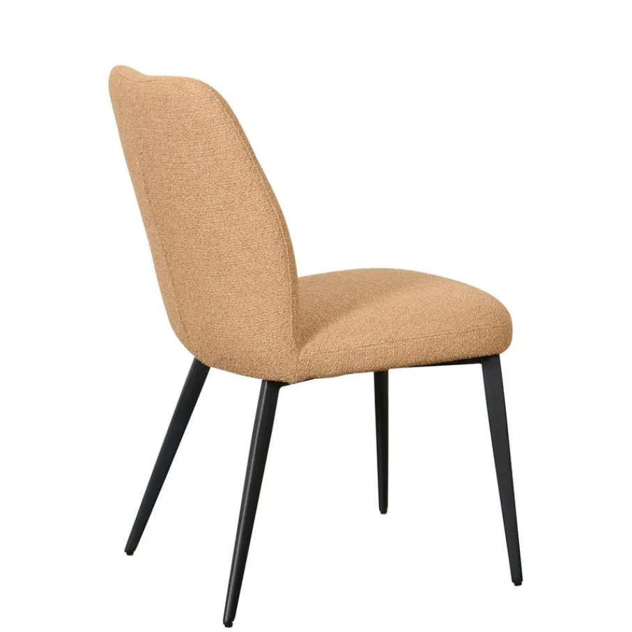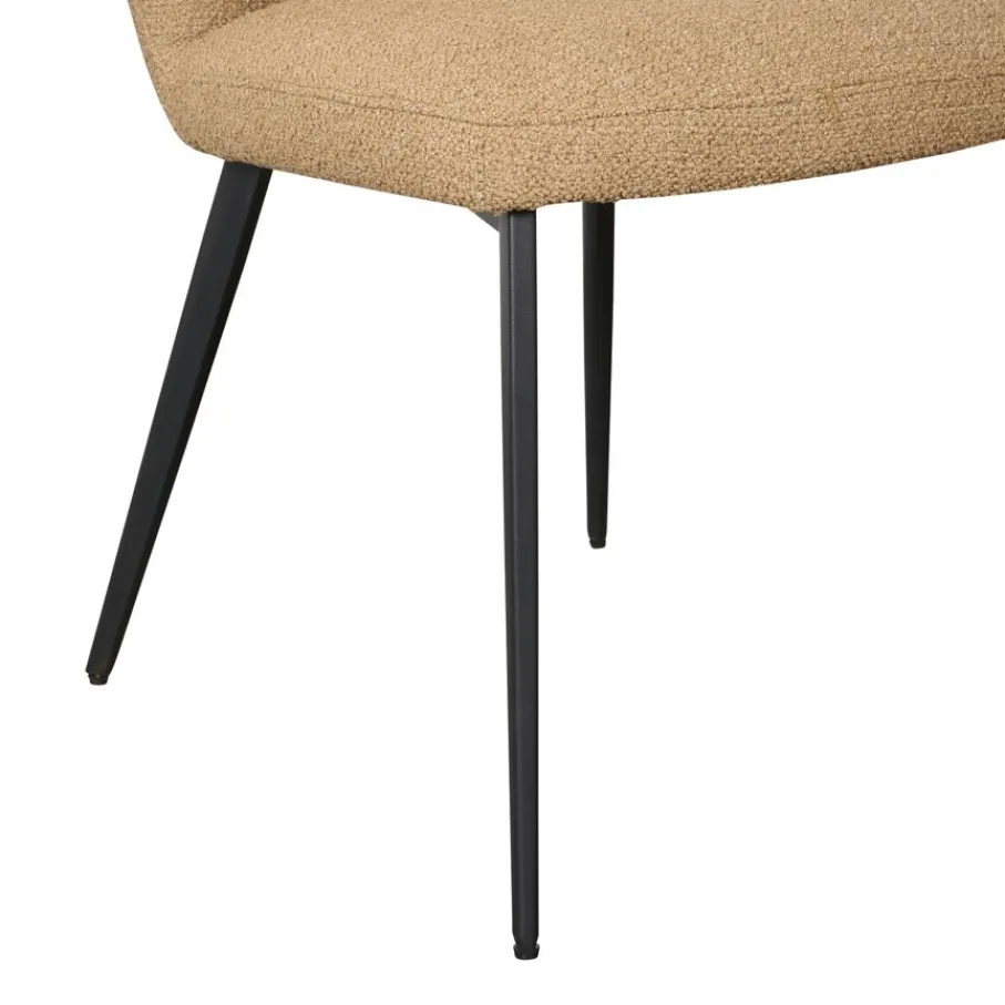 Eetkamerstoel Diest heeft een zachte bekleding in gemêleerde karamel bruine kleur. De stof heeft een rijke bouclé structuur en zorgt voor een warme uitstraling.
