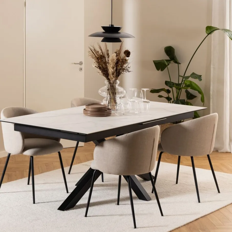 - Sterke en sfeervolle bekleding: De geweven textielstof is niet alleen slijtvast en sterk, maar geeft je eetkamer ook een warme en uitnodigende uitstraling.