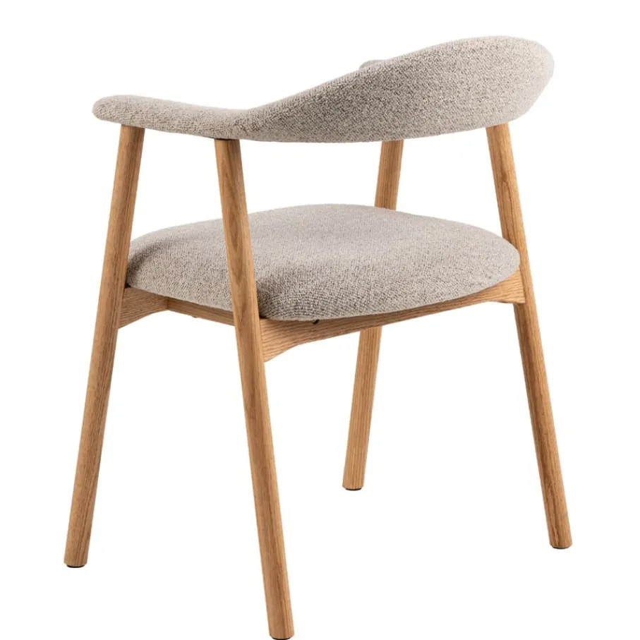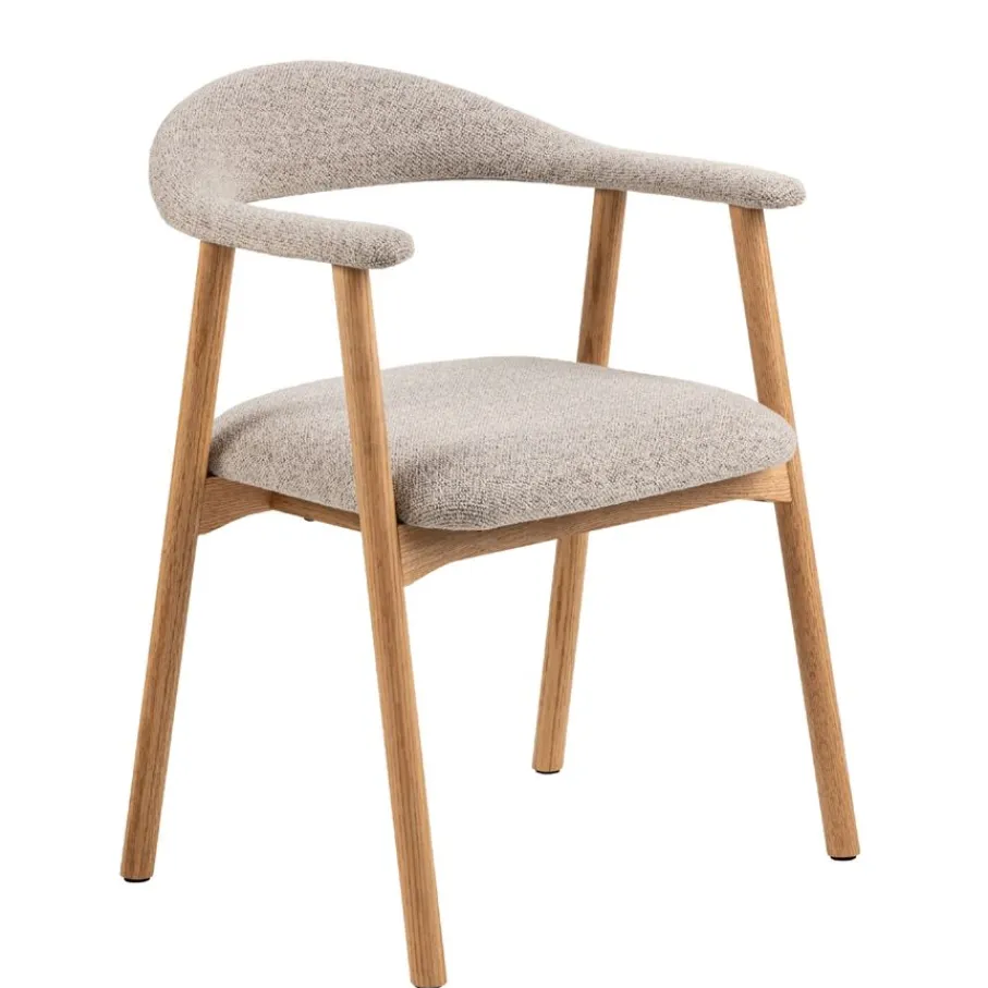 De stoel is bekleed met stof Monza, een zachte bouclé stof met een rijke structuur. De beige kleur is makkelijk te combineren met diverse kleuren en stijlen.
