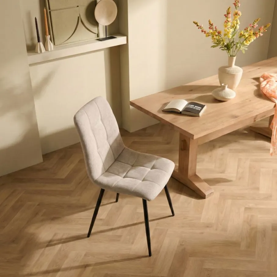 De stoel is bekleed met een fluweelzachte stof met een chenille weving. Het materiaal voelt heerlijk aangenaam aan en de lichte beige kleur (nr 03) is een neutrale tint die makkelijk combineert in diverse woonstijlen.