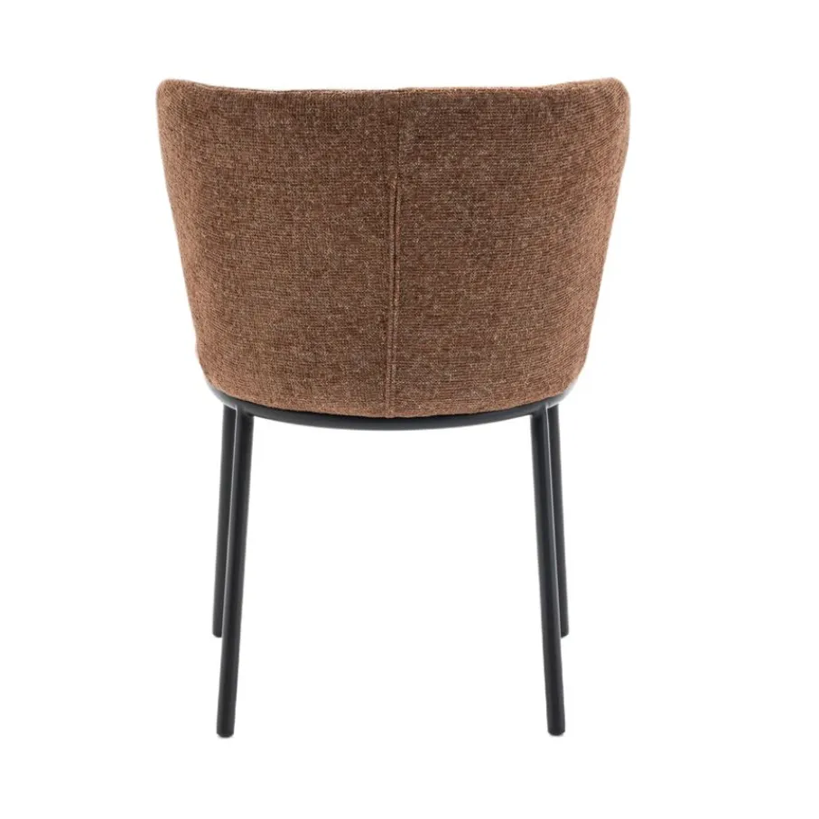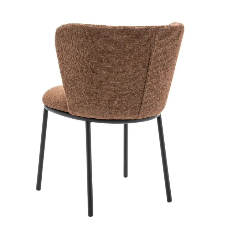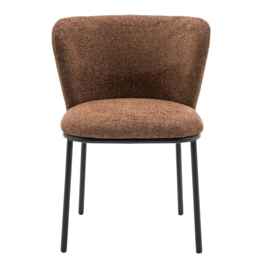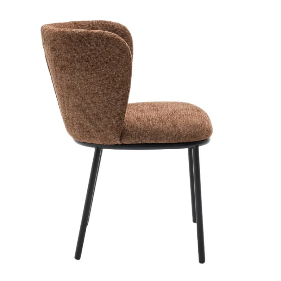 Met eetkamerstoel Maeve haal je een echte blikvanger in huis! De ronde vorm van deze prachtige stoel, gecombineerd met een elegant onderstel van zwart metaal, geeft jouw eethoek direct een frisse en moderne uitstraling. Of je nu uitgebreid gaat tafelen of gezellig bijpraat met vrienden, Maeve nodigt uit om urenlang te genieten. De mosterdbruine kleur van de stof met rijke structuur zorgt voor een warme sfeer en maakt van elke maaltijd een feestje. Eetkamerstoel Maeve is de perfecte mix van stijl en comfort.