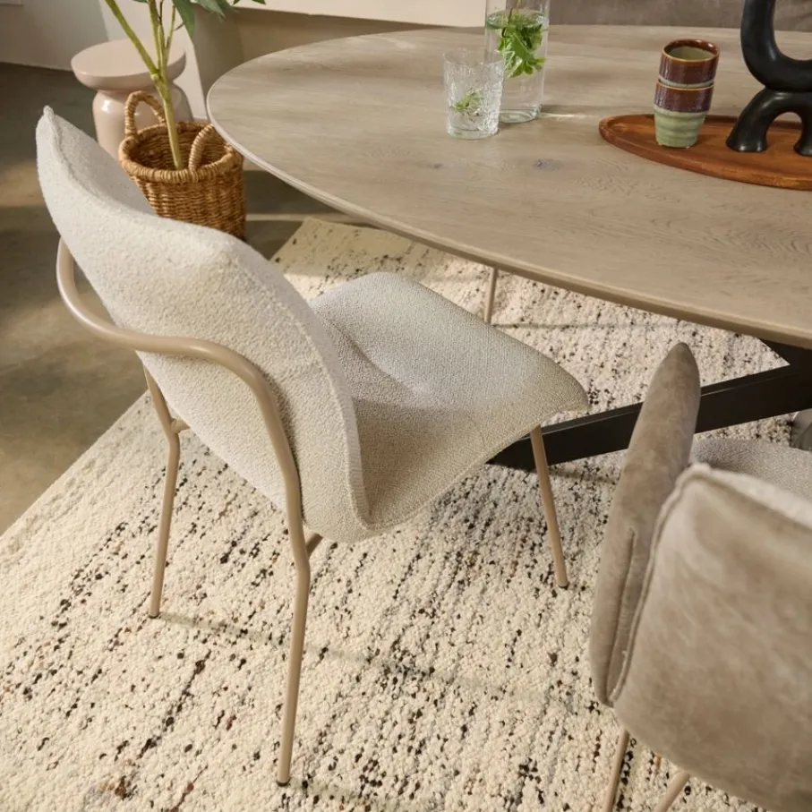 Eetkamerstoel Trondheim is bekleed met bouclé stof Cosmo in kleur Silver Cream. Deze rijke structuur stof van 100% polyester, is een sterk en slijtvast materiaal. De elegante kleur is een grijs/beige tint die makkelijk combineert.