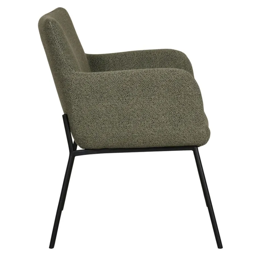 De bekleding van eetkamerstoel Viby is een mooie bouclé stof in kleur Thyme, een vergrijsd groene kleur. Stof Alpine is gemaakt van 96% polytheen en 4% Polyamide, waardoor het een zacht en sterk materiaal is.