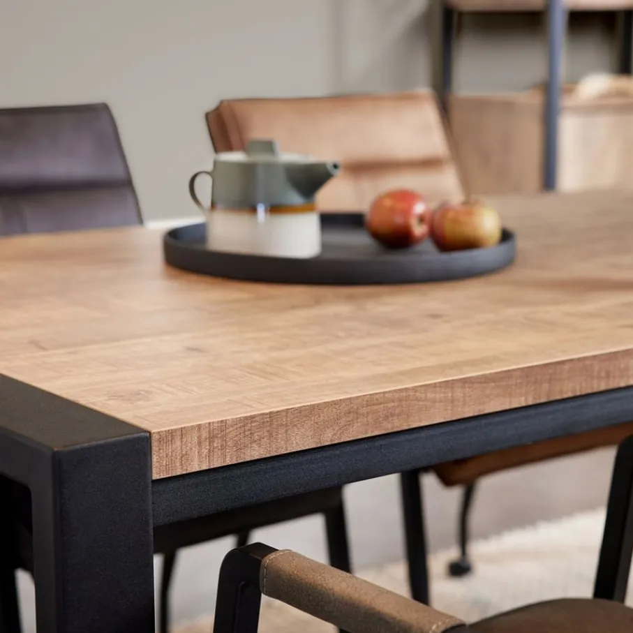 - Creëer direct een robuuste en toch warme sfeer: De opvallende mango houtlook en het stoere zwarte metalen frame geven jouw eetkamer direct karakter en gezelligheid.