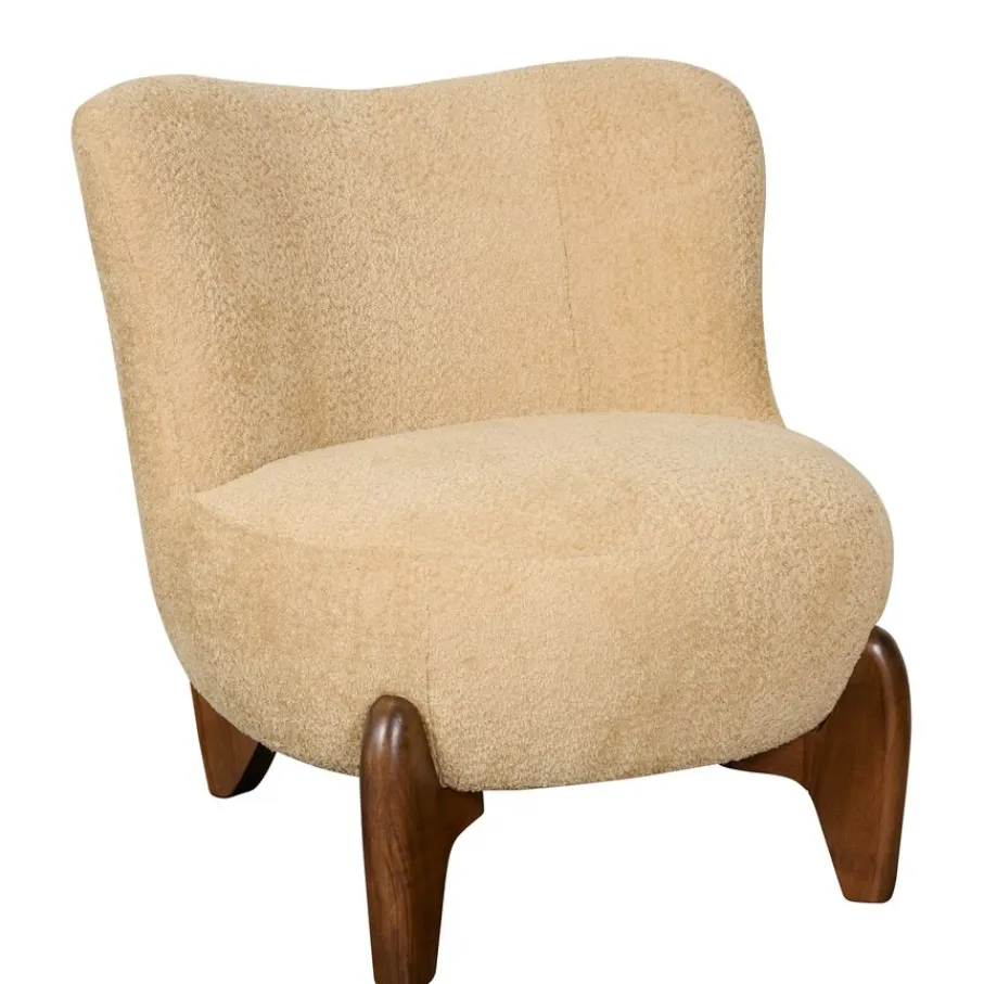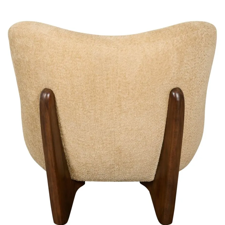 De fauteuil is bekleed met stof Crunch. Dit is een rijke structuur stof van 100% polyester, die heerlijk zacht aanvoelt. De kleur Cream is een romige kleur die een warme combinatie vormt met de donkerbruine houten poten.