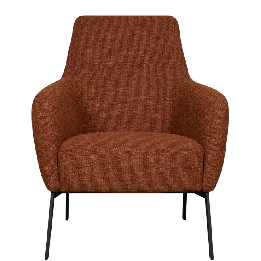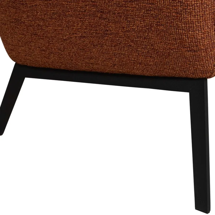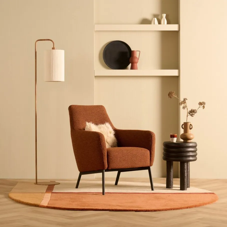 De fauteuil is bekleed met stof Lodge, een bouclé stof van 100% polyester met een robuuste structuur. De kleur is Hazel, een warme kastanjebruine tint.