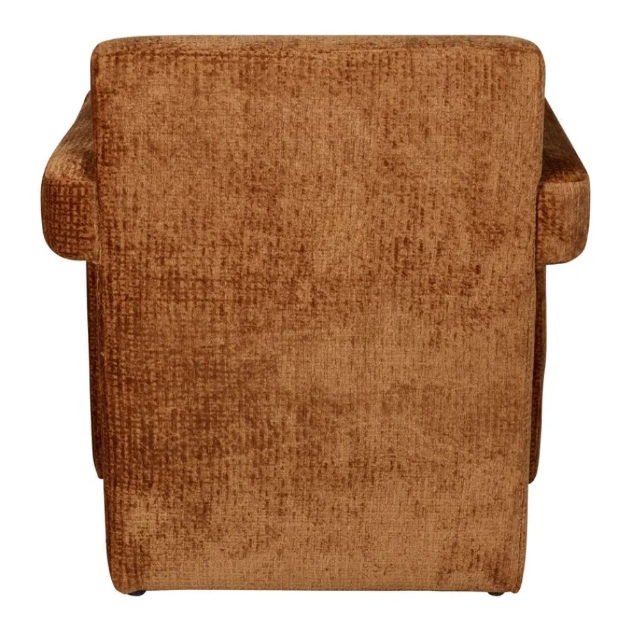 De fauteuil is volledig bekleed met stof Glam Block, een zacht materiaal van 100% polyester. De stof heeft een fraaie blokjes structuur en een warme vleug. De kleur Burned Orange is een oranje/bruine kleur die een warme touch geeft aan een interieur.
