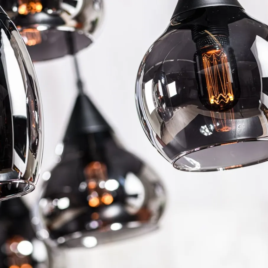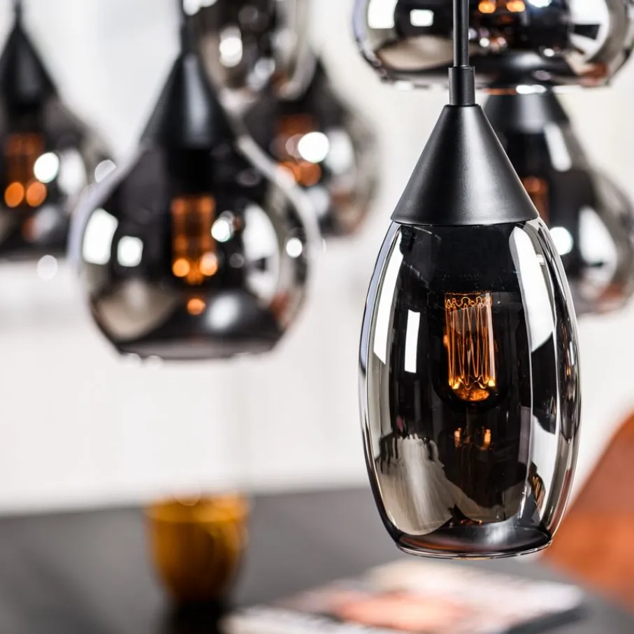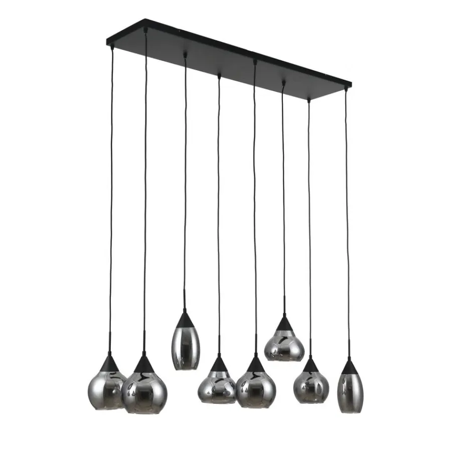 - Geniet van een sfeervolle ambiance dankzij de mix van 8 glazen kappen in een elegante smoke kleur, die een warme en rustgevende gloed verspreiden.