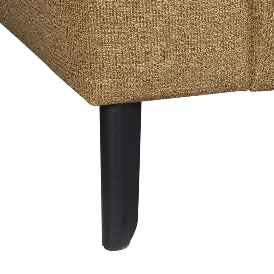 Hoekbank Ameland is bekleed met stof Leaf, een zachte stof van 100% polyester. De stof heeft een wat blokjes achtige structuur. De kleur is Mustard, een gemêleerde okergele tint. Deze kleur staat prachtig in combinatie met warme houtkleuren en met contrasterend zwart wordt het weer een stoer geheel.