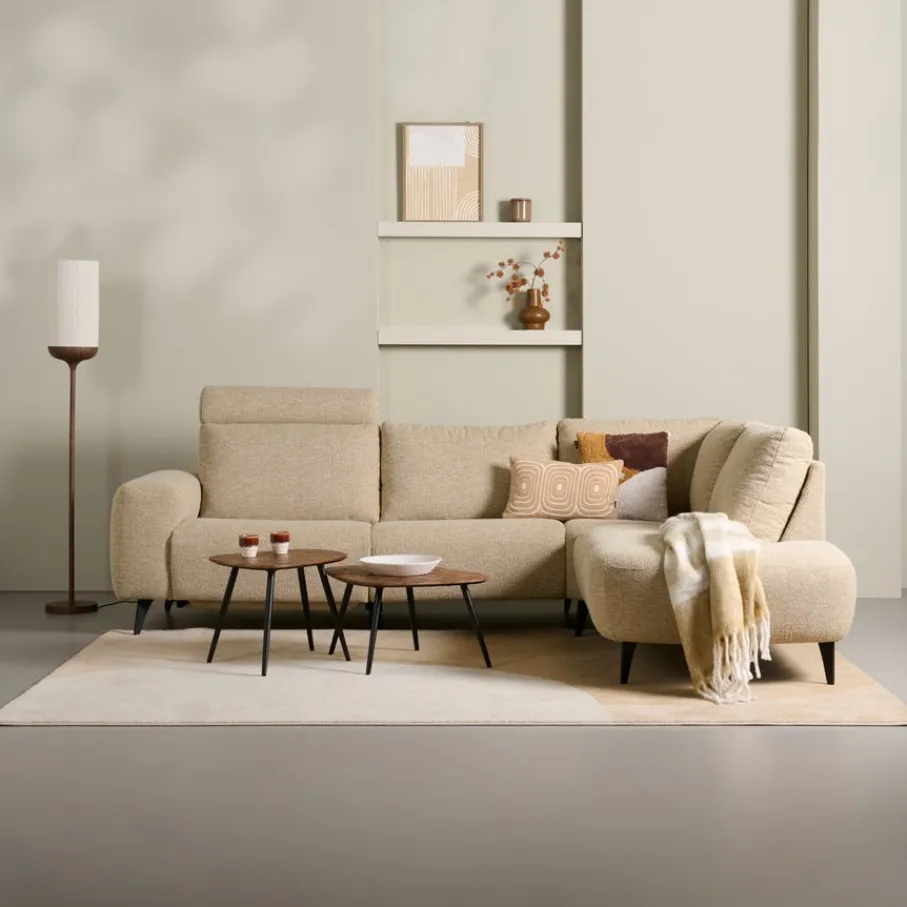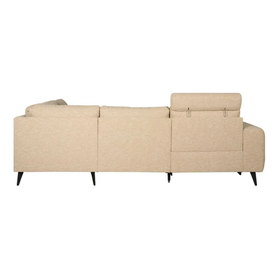 De bekleding van hoekbank Axel voelt prettig aan en biedt de perfecte mix van steun en zachtheid. Deze stof heeft een subtiele structuur en een gemêleerde zandkleur. Met Axel haal je niet alleen een bank, maar een compleet relaxervaring in huis.