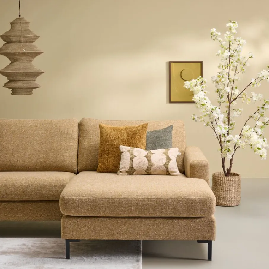 Hoekbank Brixton is bekleed met stof Oasis, een mooie bouclé stof van 100% polyester. De stof heeft een robuuste structuur en een mooie gemêleerde okergele kleur. De losse rugkussens zijn aan beide zijden volledig gestoffeerd. We adviseren om ze regelmatig te keren, voor een duurzaam gebruik.