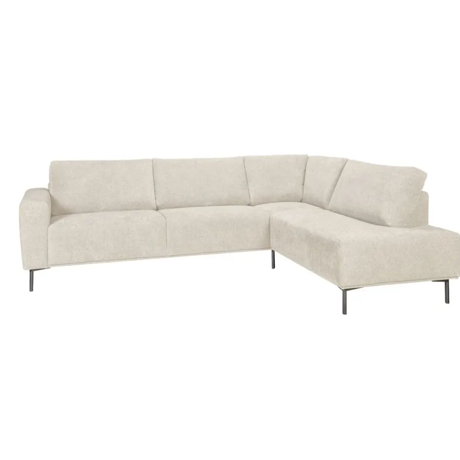 Hoekbank Deventer wordt als pakket geleverd en vereist nog eenvoudige montage. De zwart metalen poten moeten nog gemonteerd worden, waarna de twee elementen met elkaar gekoppeld kunnen worden.