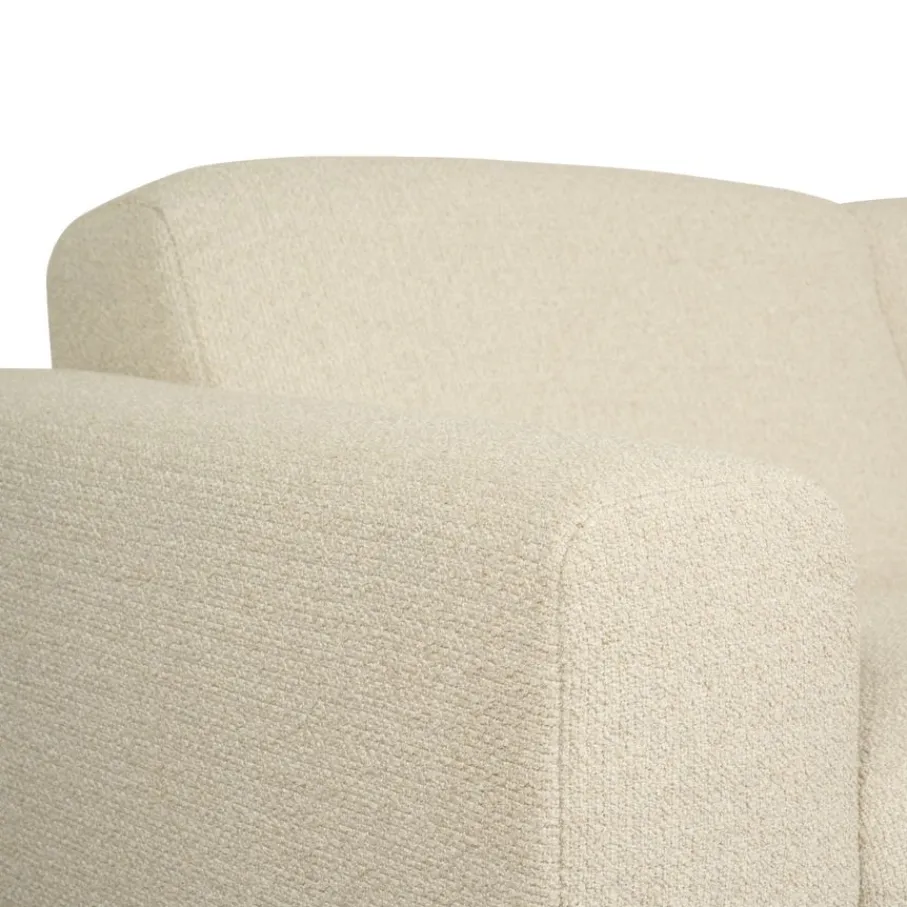 De stoffering van hoekbank Kobe heeft een rijke structuur en een gemêleerde beige kleur. Deze stof voelt niet alleen heerlijk zacht aan, maar geeft de bank ook een luxe en exclusieve uitstraling. De neutrale tint is makkelijk te combineren met andere kleuren en materialen in je interieur, waardoor je eindeloos kunt variëren met hoekbank Kobe.