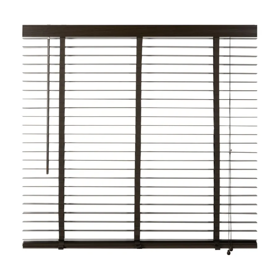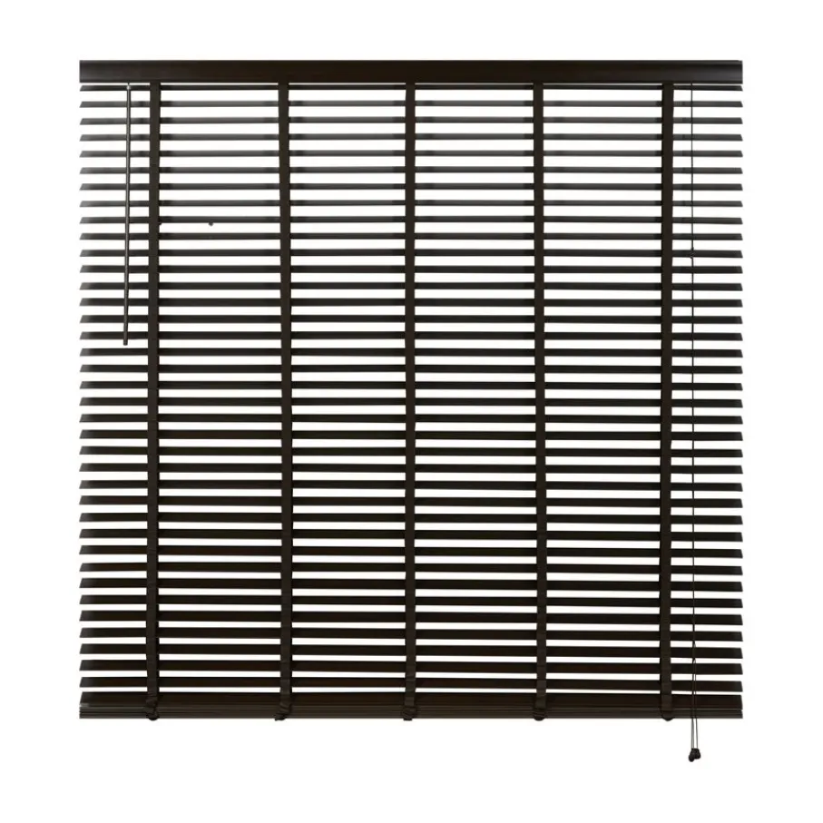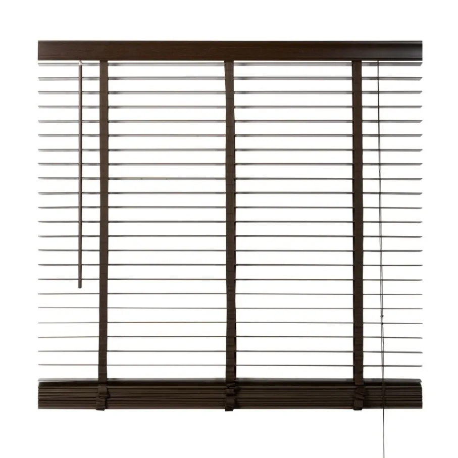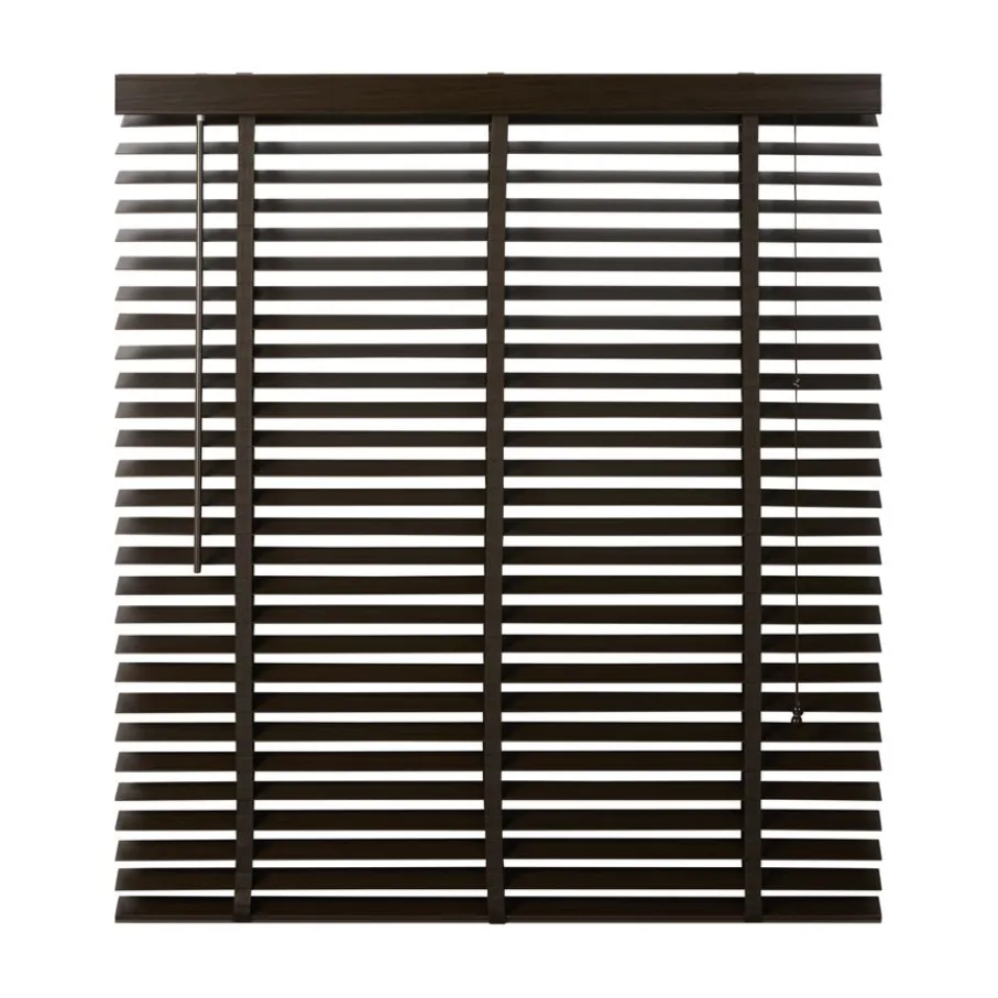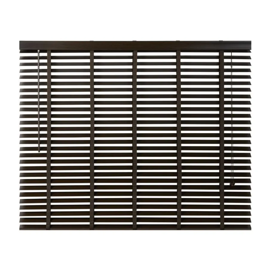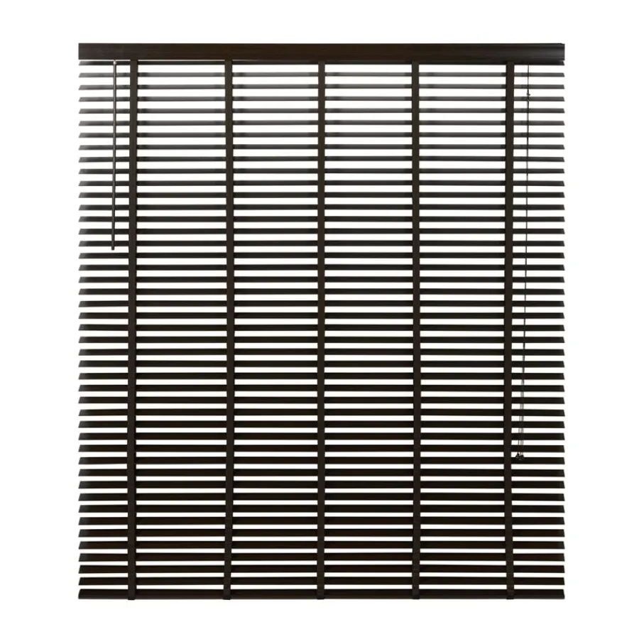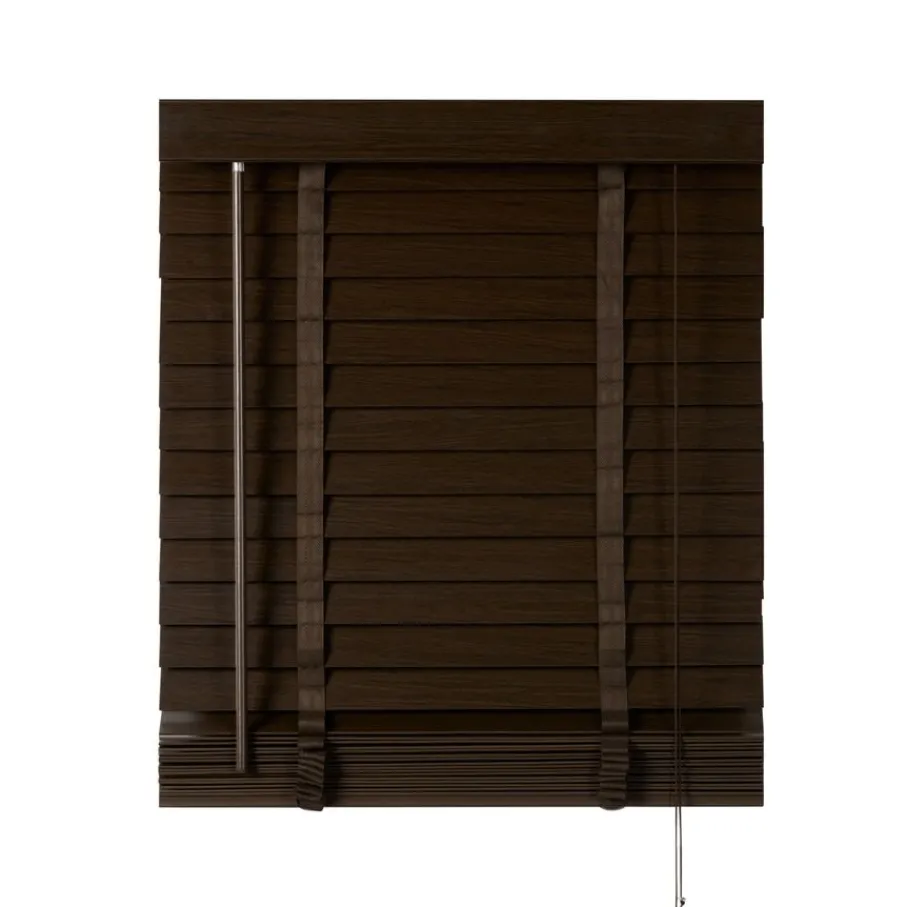 De lindehouten jaloezie heeft een donkerbruine kleur en lamellen van 50 mm. Ter afwerking zit er aan de bovenkant een afdeklat in dezelfde bruine kleur met luxe profiel. Ook de bedieningskoorden en verticale ladderbanden zijn in bijpassende bruine tint, waardoor de jaloezie volledig in dezelfde kleur is. Deze jaloezie is in veel meer standaardmaten leverbaar, perfect om met elkaar te combineren. Ook is de jaloezie er in zwart, wit en een naturel houtkleur.
