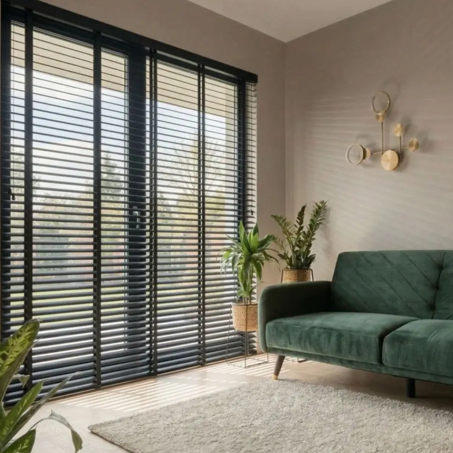 - Creëer direct een stijlvolle en knusse sfeer in huis met deze prachtige zwarte jaloezie, een echte eyecatcher.