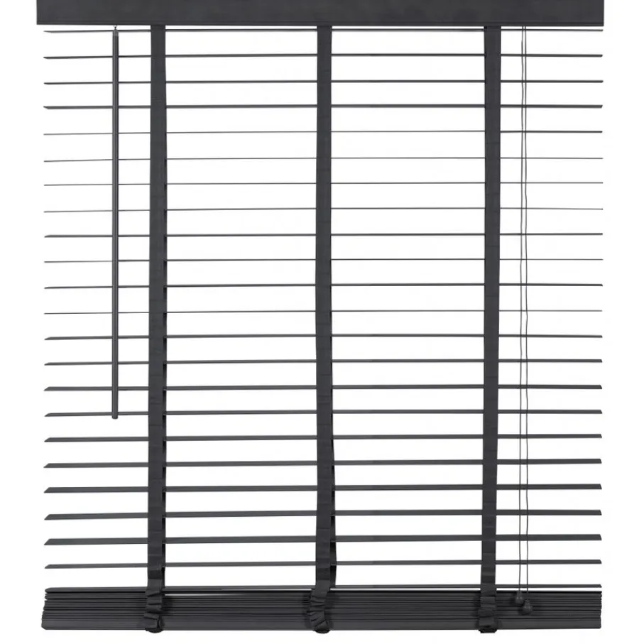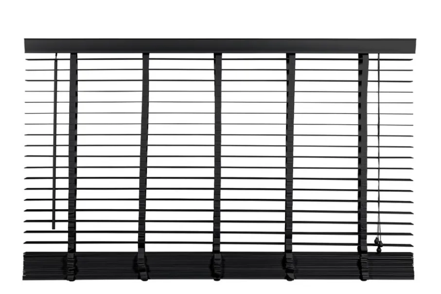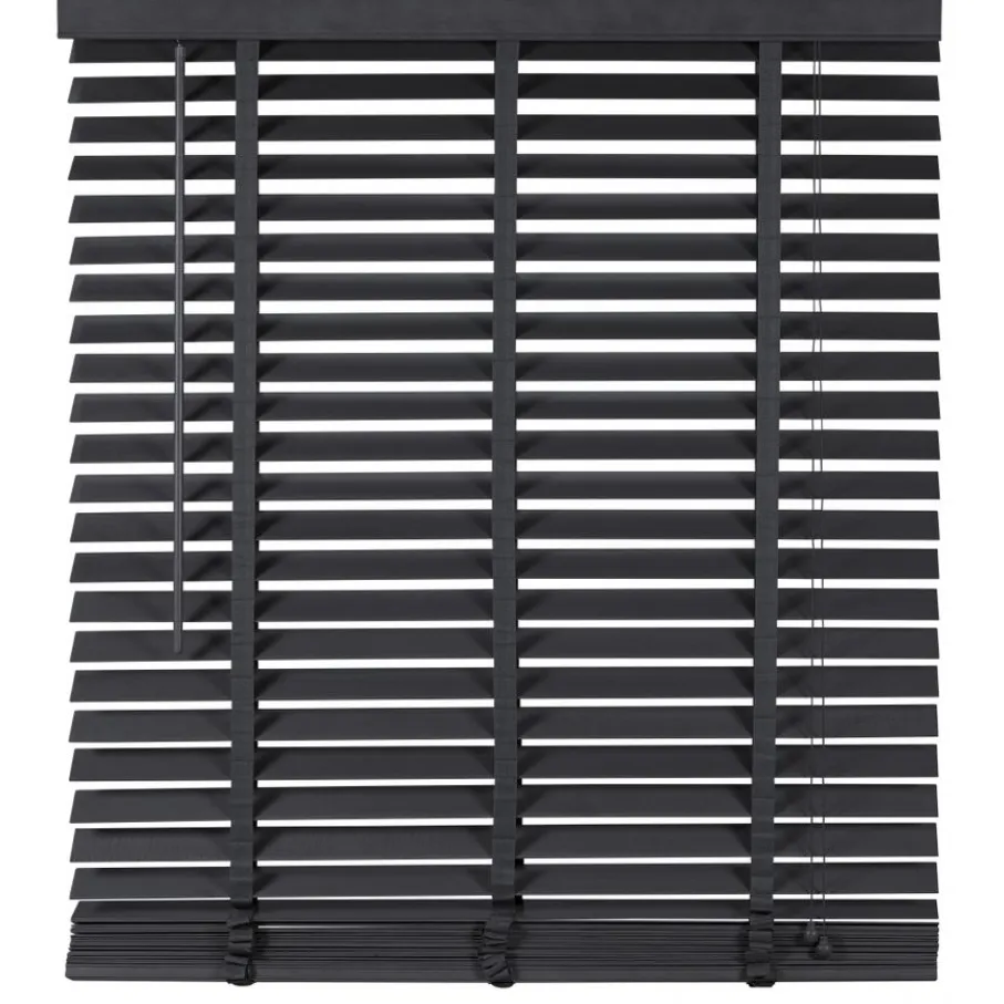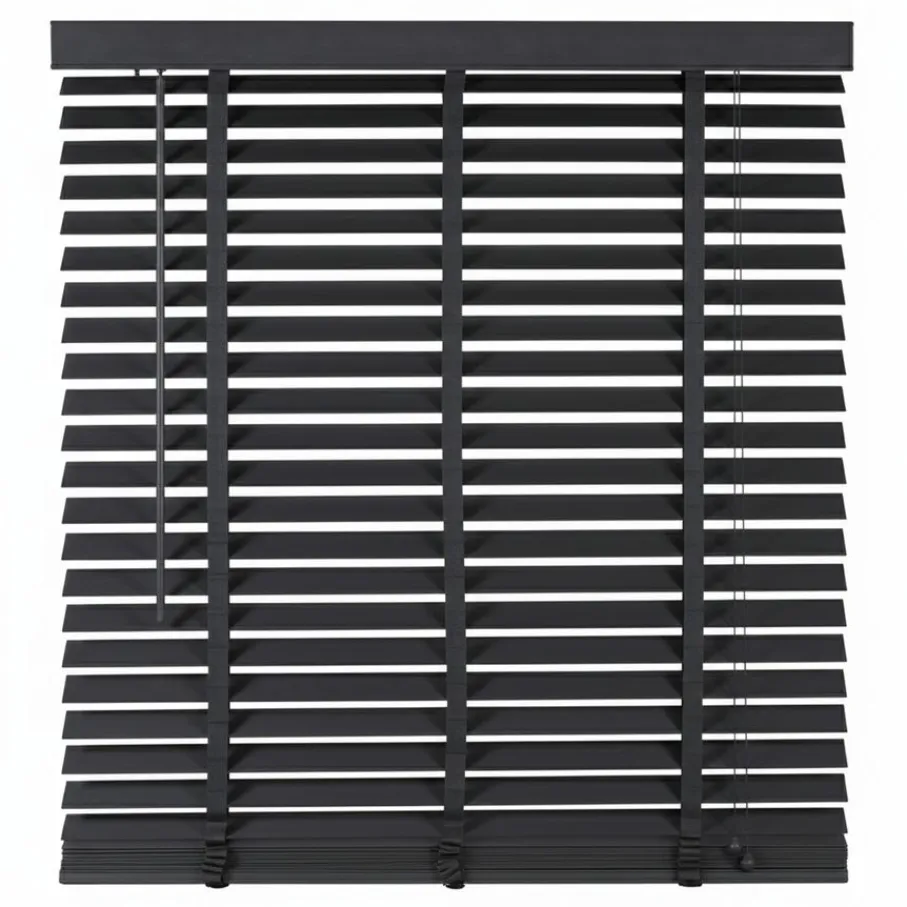De zwarte houten jaloezie heeft een gladde structuur zonder houtnerf. De bovenkant bestaat uit een aluminium cassette met een zwarte afdeklat van MDF met een luxe profiel ter afwerking. Ook de bedieningskoorden en verticale ladderbanden zijn zwart, waardoor de jaloezie volledig in dezelfde zwarte kleur is. Deze ladderbanden hebben een fraaie geweven structuur.