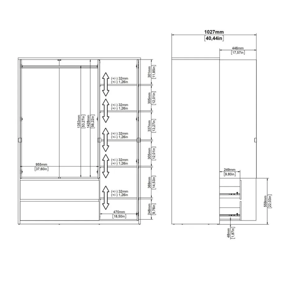 - Houd je kleding heerlijk overzichtelijk met de combinatie van een hangplek, verstelbare legplanken én twee ruime lades.