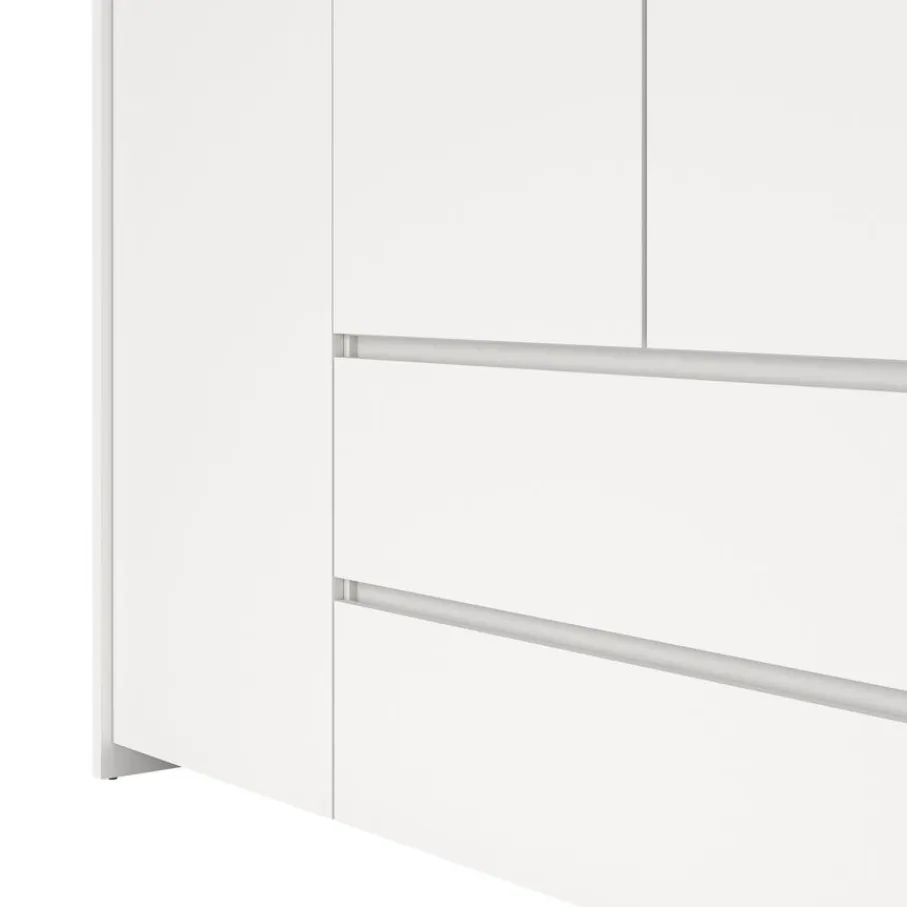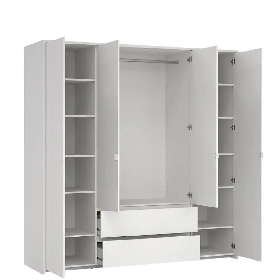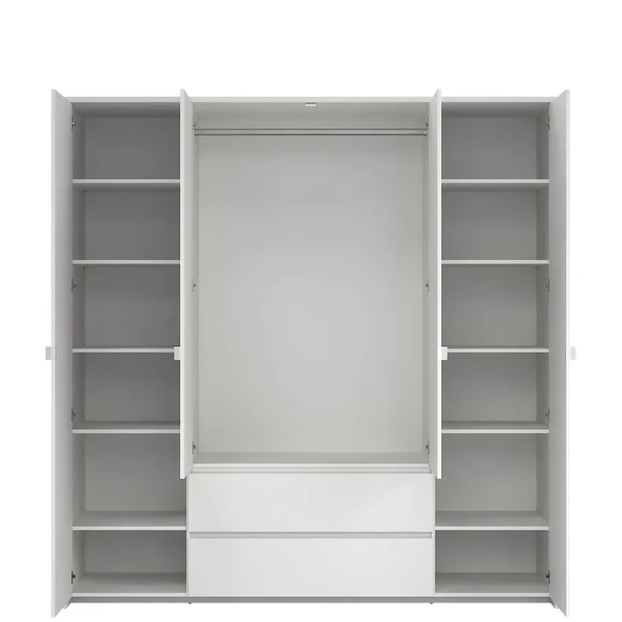 Atlanta is de perfecte opbergoplossing met 4 deuren en 2 brede lades. In de kast zitten 11 legplanken, waarvan 10 verstelbaar en één vast. Met een combinatie van hangruimte en legplanken biedt kledingkast Atlanta flexibele opbergmogelijkheden om je kleding georganiseerd en toegankelijk te houden.