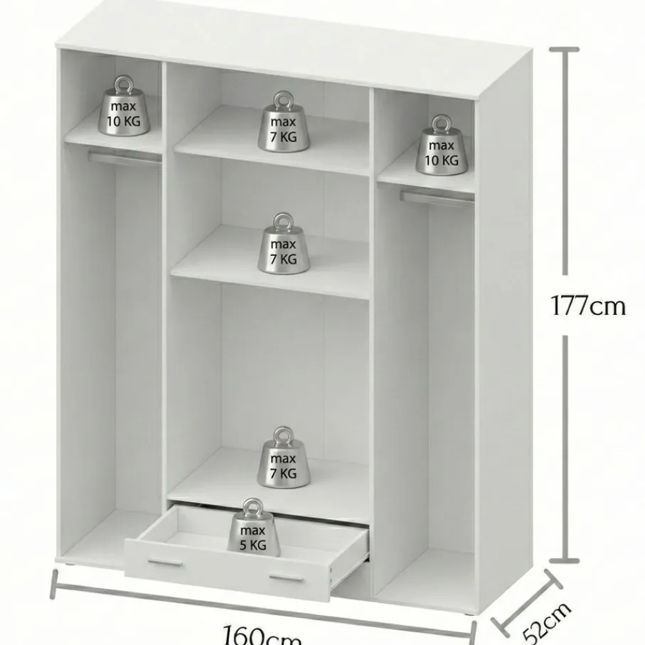 - Houd je garderobe heerlijk georganiseerd met de slimme indeling van roedes, legplanken én twee handige lades.