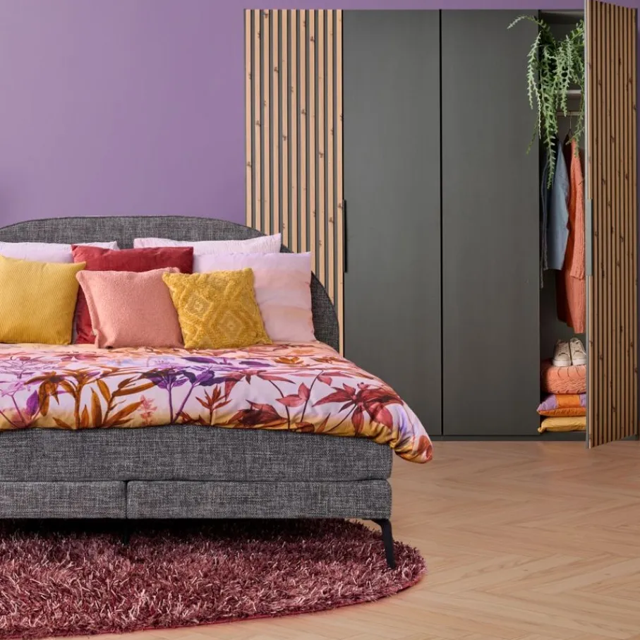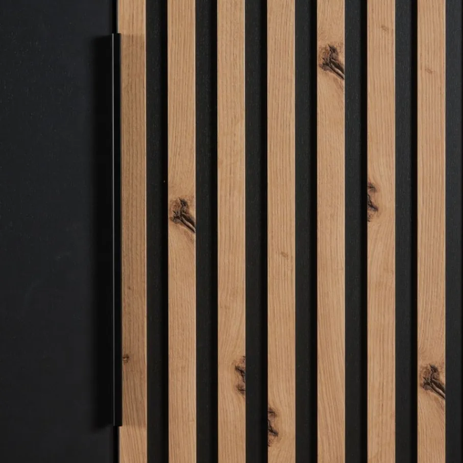 - Maak van je slaapkamer een stijlvolle oase met deze kledingkast die direct de aandacht trekt dankzij het unieke lattenlook decor en de elegante grafietgrijze afwerking.