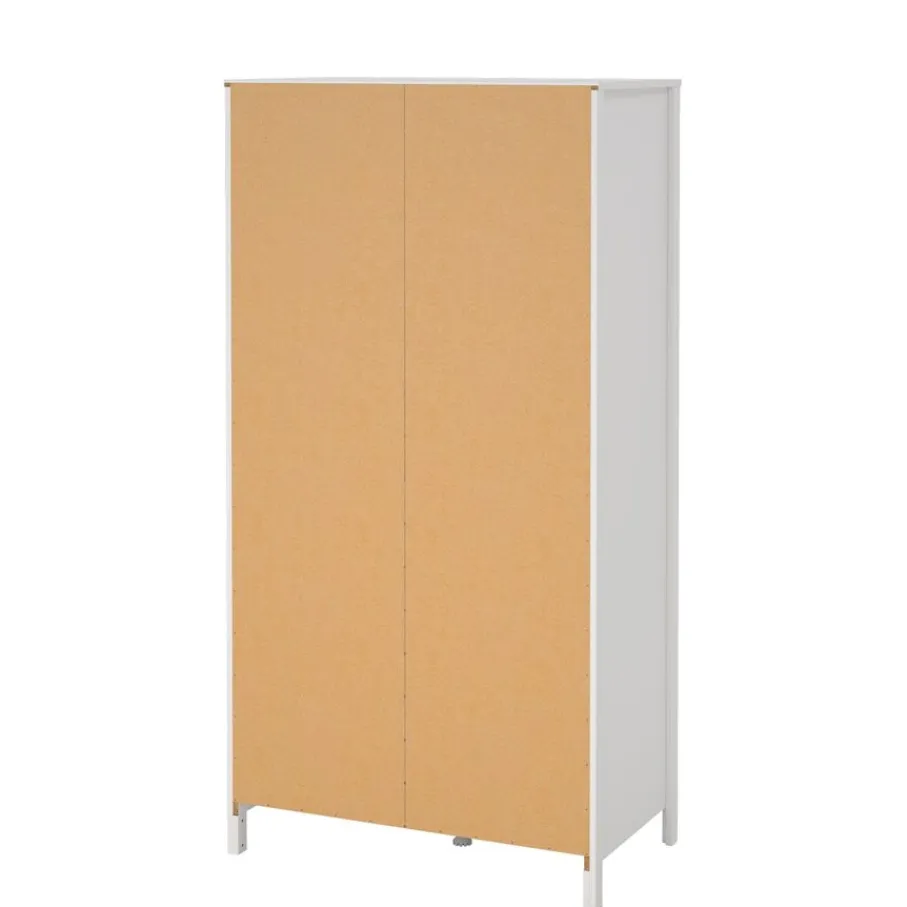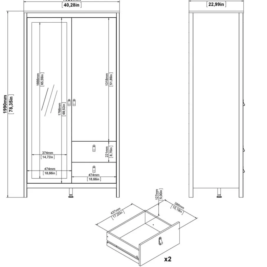 Kledingkast Dallas heeft 2 draaideuren, waarvan de linker er een spiegel op heeft. Rechts onderaan zitten 2 handige lades, perfect om kleine items in op te bergen. Het interieur bevat 2 vaste legplanken en 3 verstelbare planken. Ook is er een roede voor hangkleding.