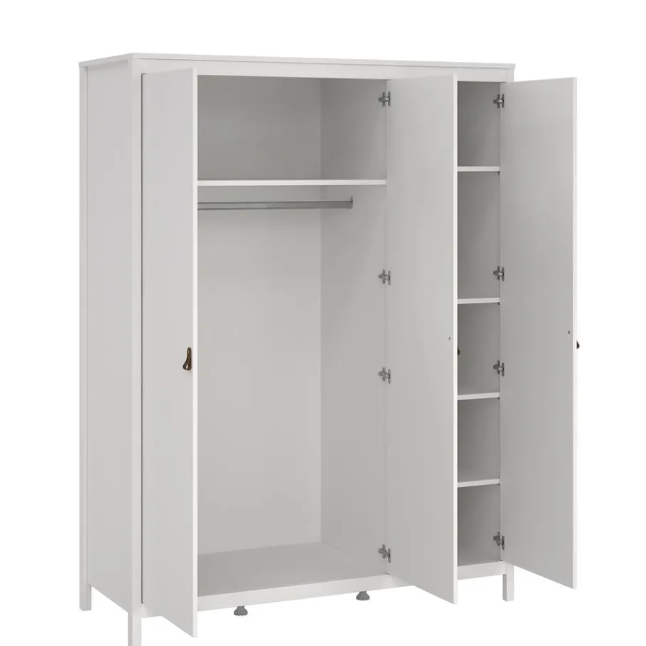 Kledingkast Dallas heeft 3 draaideuren. Links zit een breed vak met een vaste plank en roede erin. Rechts zit een smaller vak met één vaste en 2 verstelbare legplanken.