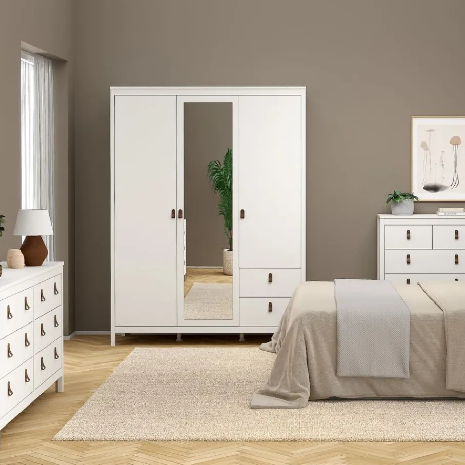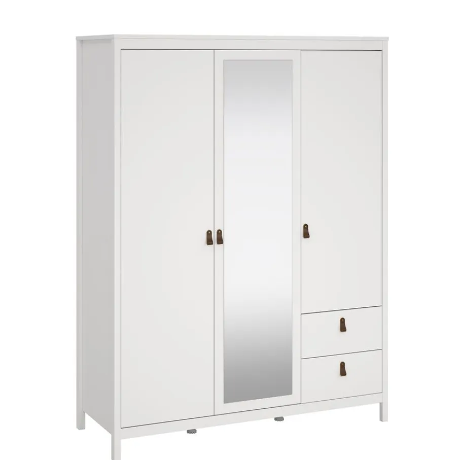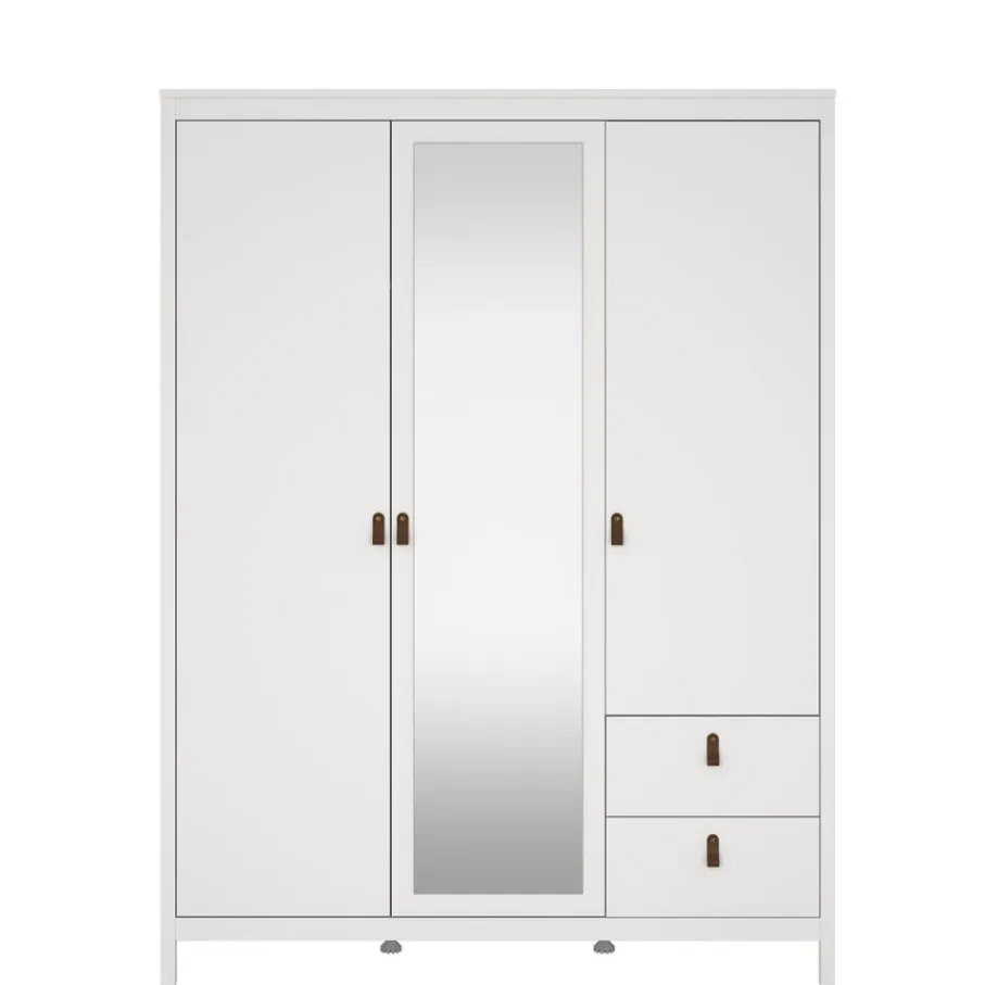 Kledingkast Dallas heeft 3 draaideuren, waarvan de middelste er een spiegel op heeft. Links zit een breed vak met een vaste plank en roede erin. Rechts zit een smaller vak met één vaste en 2 verstelbare legplanken. Daaronder zitten 2 handige lades, perfect om kleine items in op te bergen.