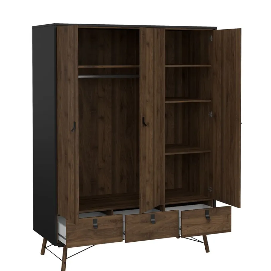 Deze kledingkast heeft links een dubbeldeurs vak met een plank en roede erin. Aan de rechterkant zit een enkeldeurs vak met 3 planken erin. Verder zijn er onderin nog 3 handige lades, waardoor Denver ruime opbergmogelijkheden biedt. De metalen handgrepen op de deuren en lades zorgen voor een speels accent.