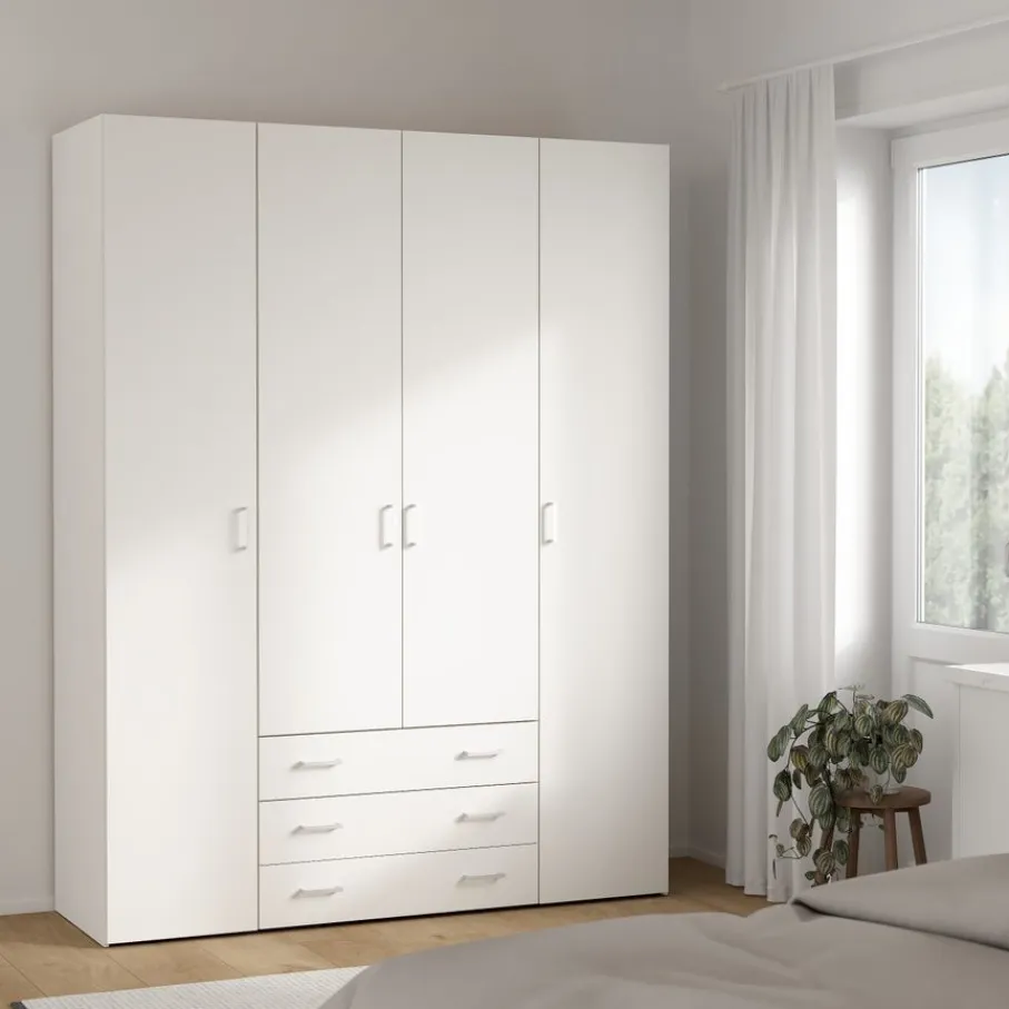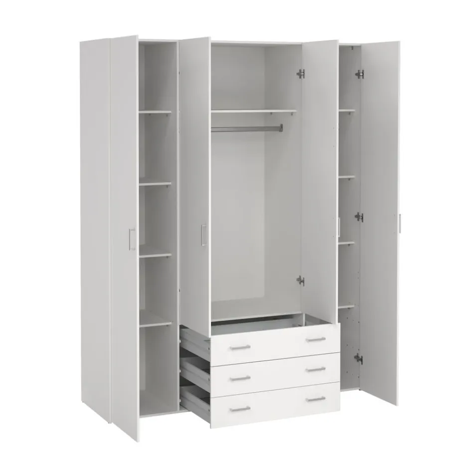 Kledingkast Harper is een praktische toevoeging voor elke kamer. De kast heeft een handige indeling met links en rechts een vak met een enkele deur. In deze vakken van elk 37 cm breed zitten vier legplanken. In het midden zit een breed vak met een dubbele deur met daarachter een roede en een legplank. Daaronder zijn er ook nog drie brede lades en zo berg je alles overzichtelijk op, en is jouw kamer altijd netjes.