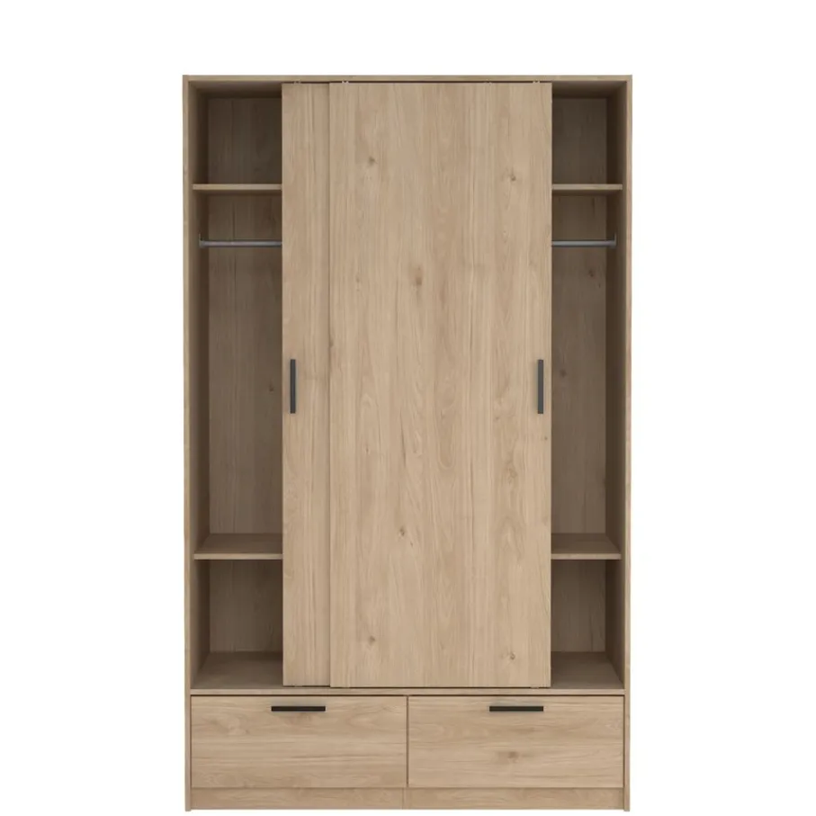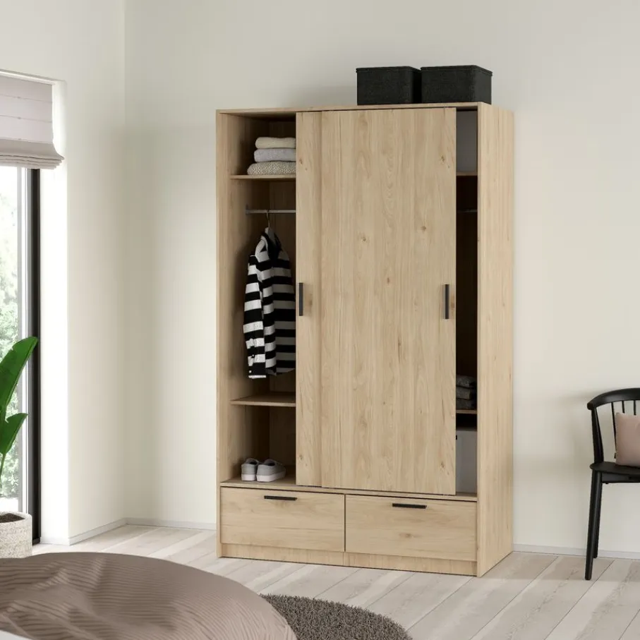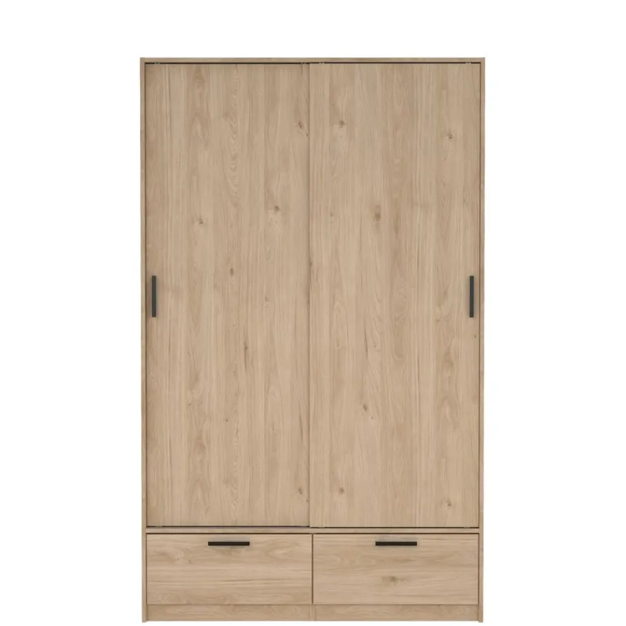 - Geef je slaapkamer direct een stoere en natuurlijke uitstraling met deze moderne kledingkast in warme eiken houtlook en strakke zwarte grepen.