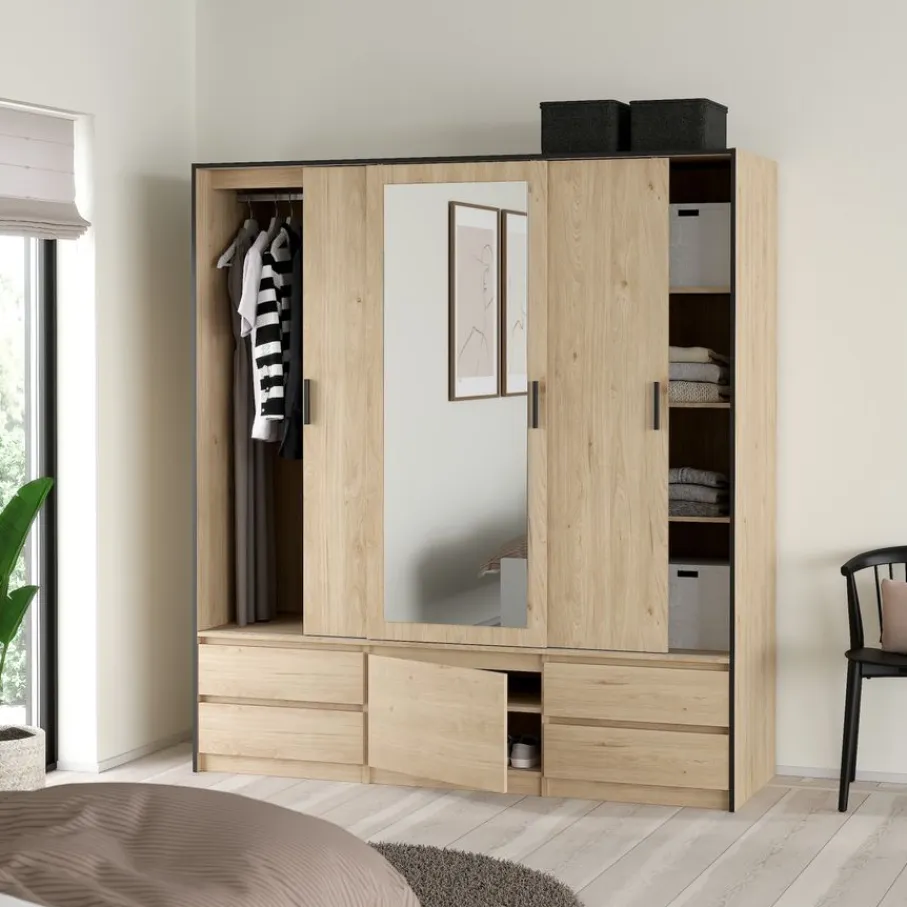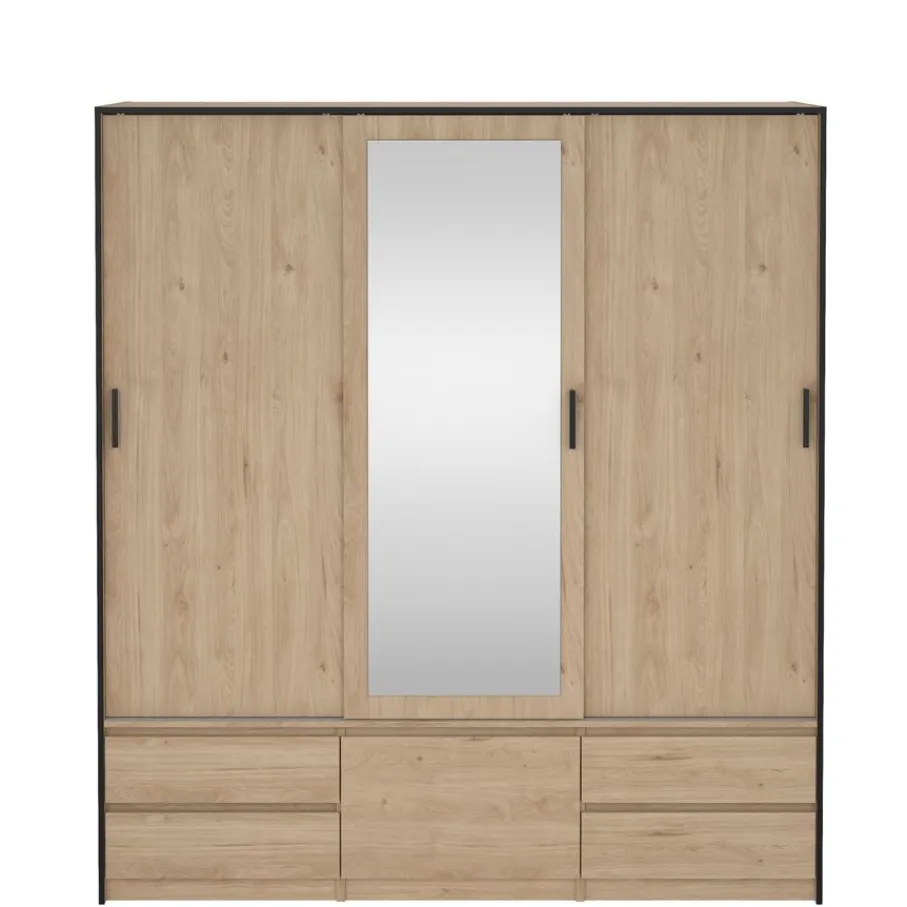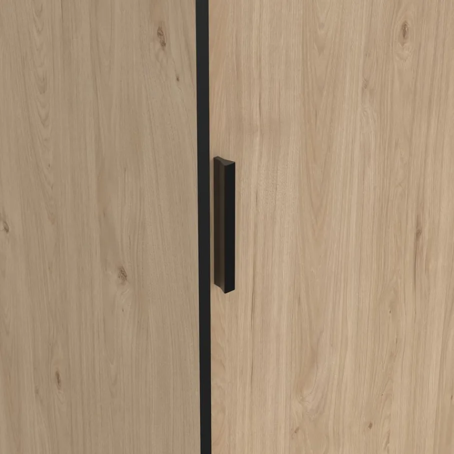 - Geef je slaapkamer een warme, moderne uitstraling met deze prachtige kledingkast in sfeervolle eiken houtlook en strakke zwarte details.