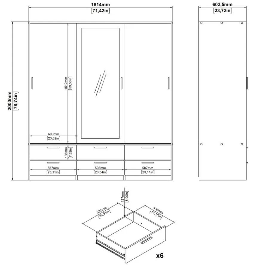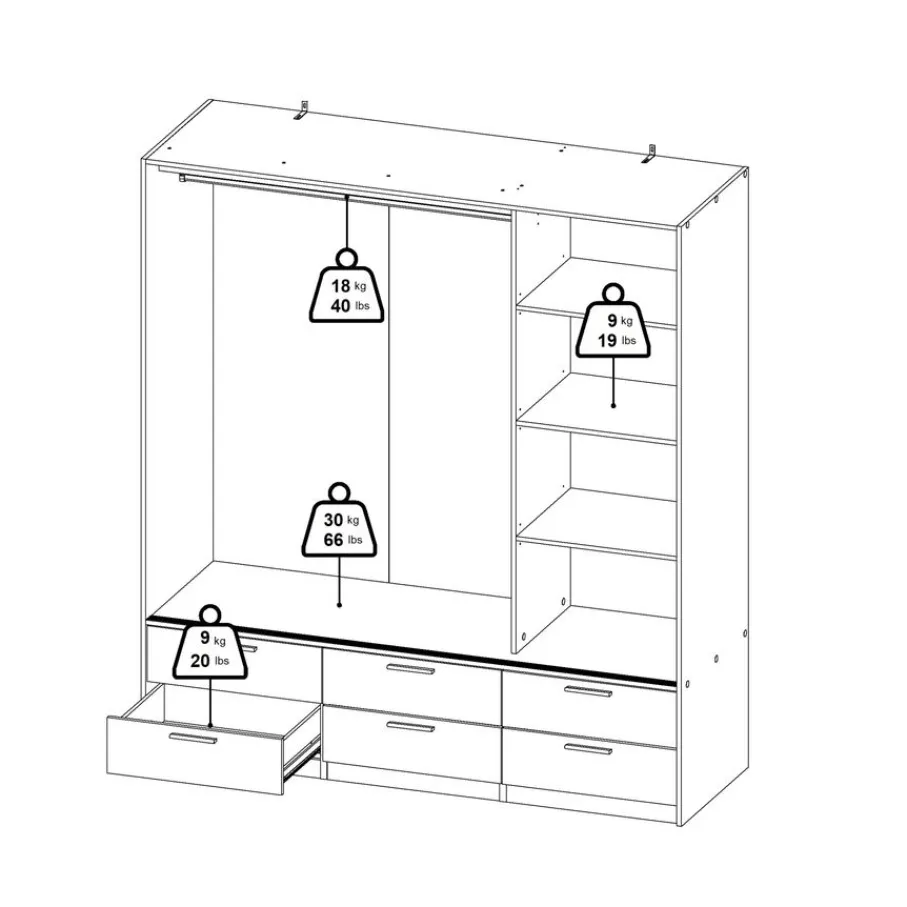- Houd je complete garderobe perfect georganiseerd met de slimme indeling van een roede, legplanken én wel zes ruime lades.