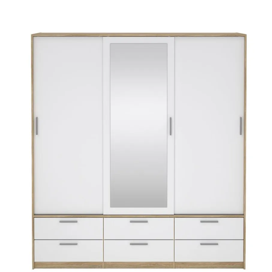Deze Jasper kledingkast heeft 3 schuifdeuren met daarachter een breed en een smal vak. Het brede vak aan de linkerkant heeft er één roede in. Het smalle vak aan de rechterkant heeft er 3 planken in. Aan de onderkant van de kast zitten 6 lades met handige opbergruimte voor bijvoorbeeld sokken en ondergoed. De deuren en lades hebben kunststof grepen in RVS look.